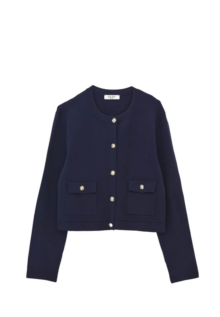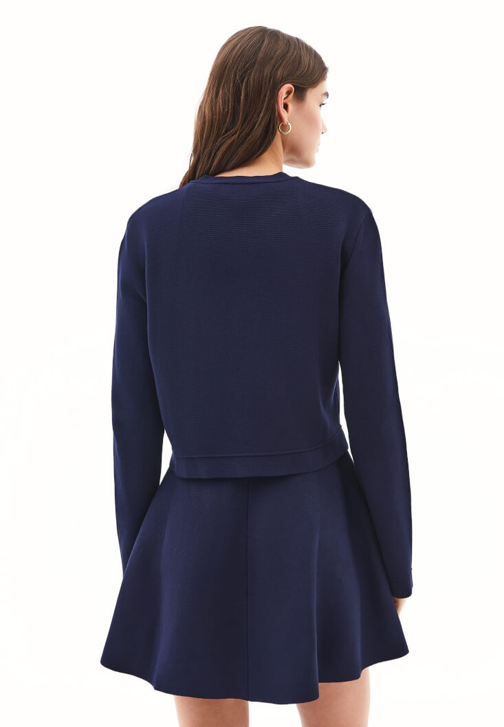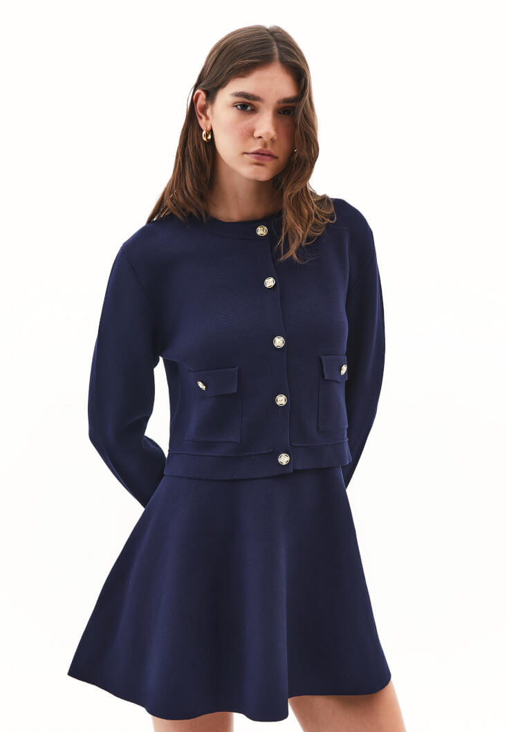 Viskon karışımlı özel triko, sıfır yaka, düğme kapamalı, crop kesim, bedenden uzak relax fit, düğmeli cep detaylı, uzun kollu.