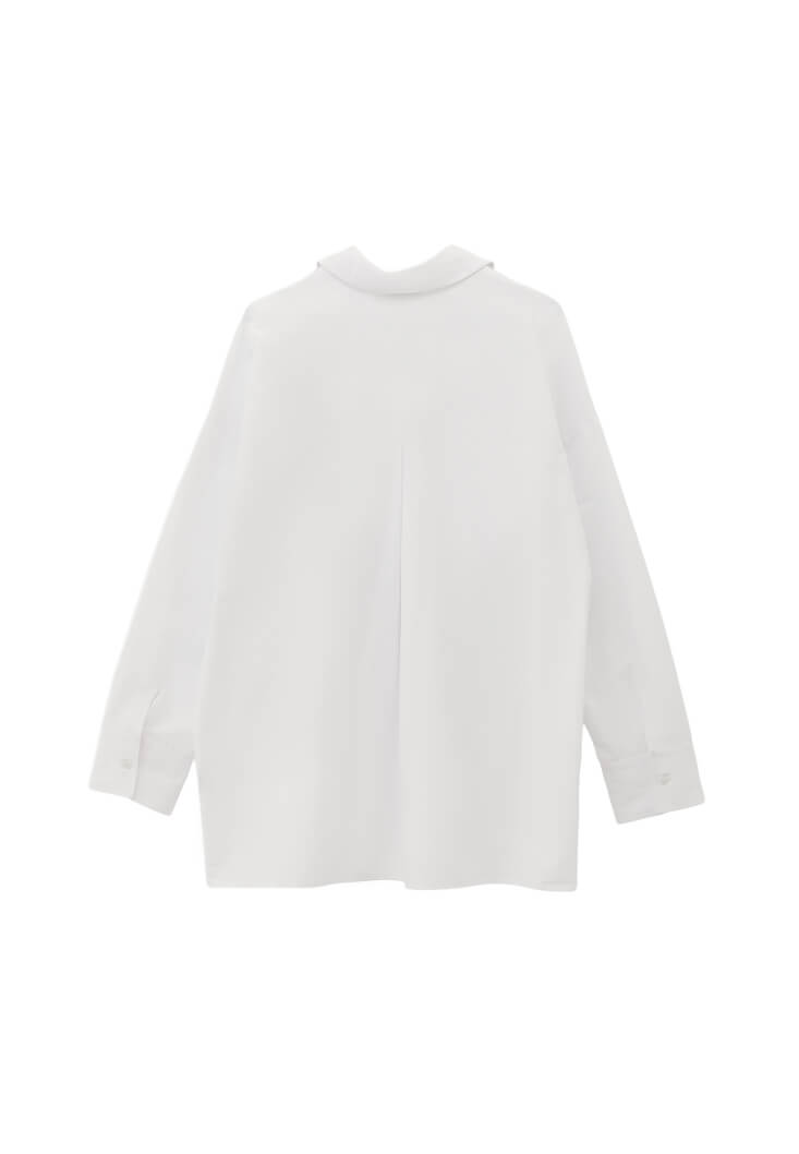 Pamuk karışımlı özel doku, bedenden uzak big shirt fit, uzun kollu, düğme kapamalı, arka kısmı pile detaylı.