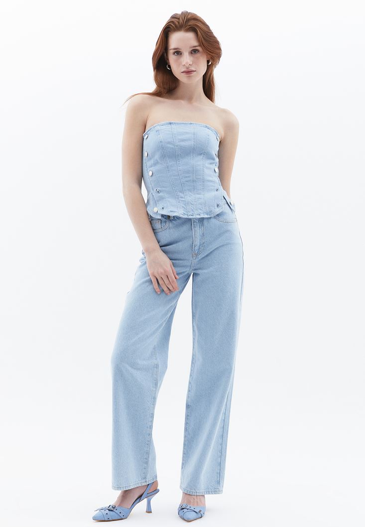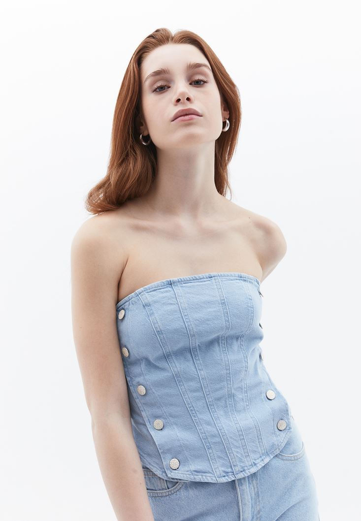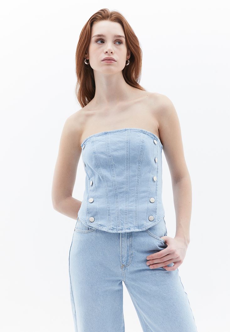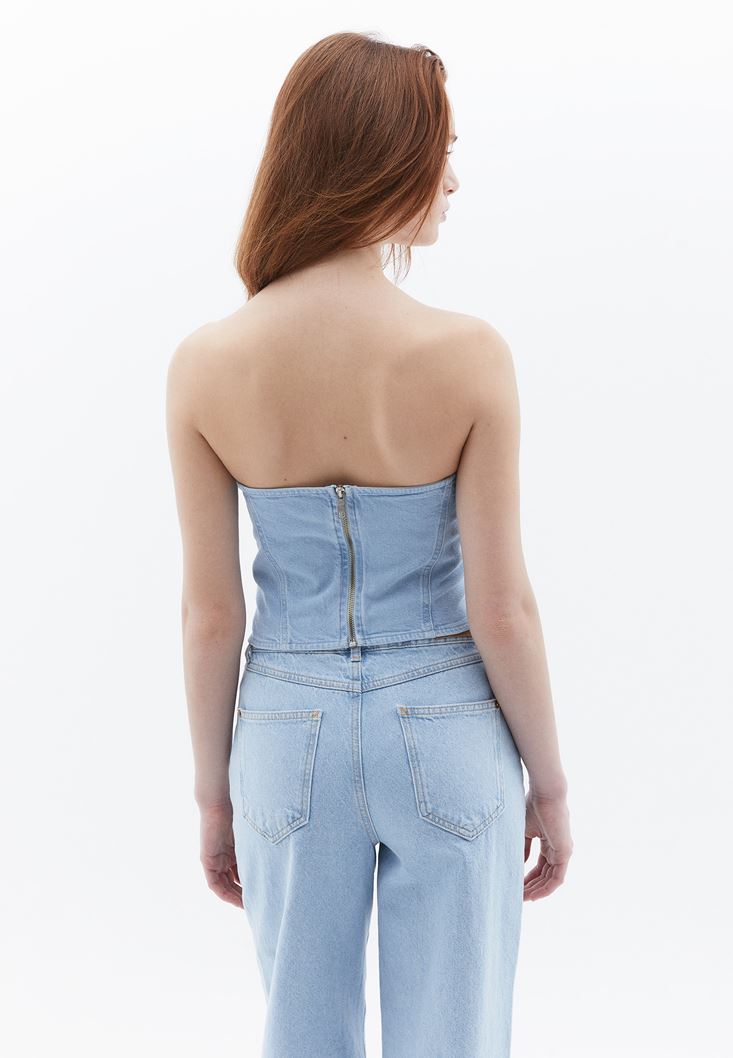 • Bayan Mavi Düğme Detaylı Straplez Top