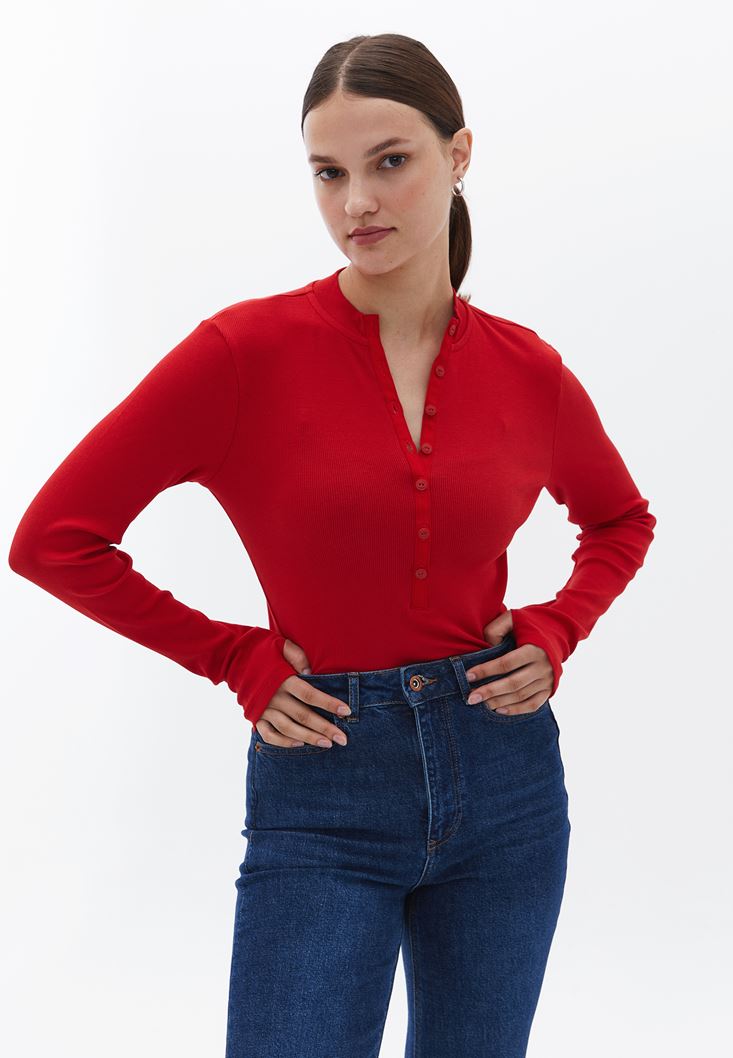 • Bayan Kırmızı Düğme Detaylı Tişört