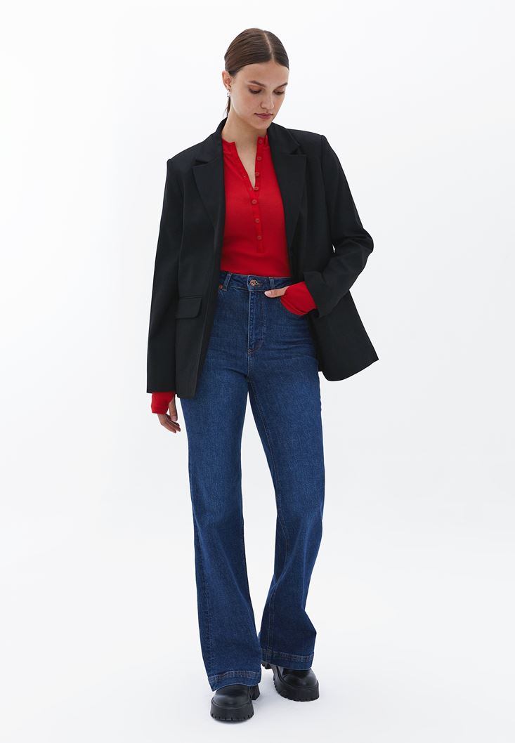 Pamuk karışımlı esnek doku, yüksek yaka, uzun kollu, yakası düğme kapamalı, bedeni saran fit.