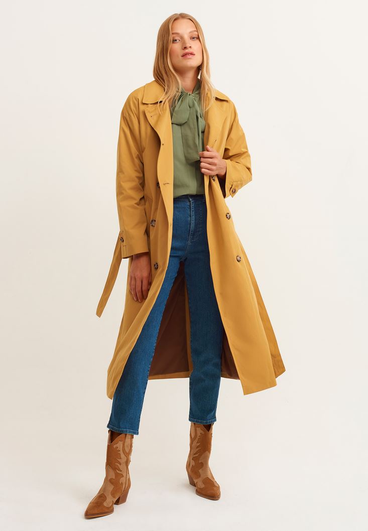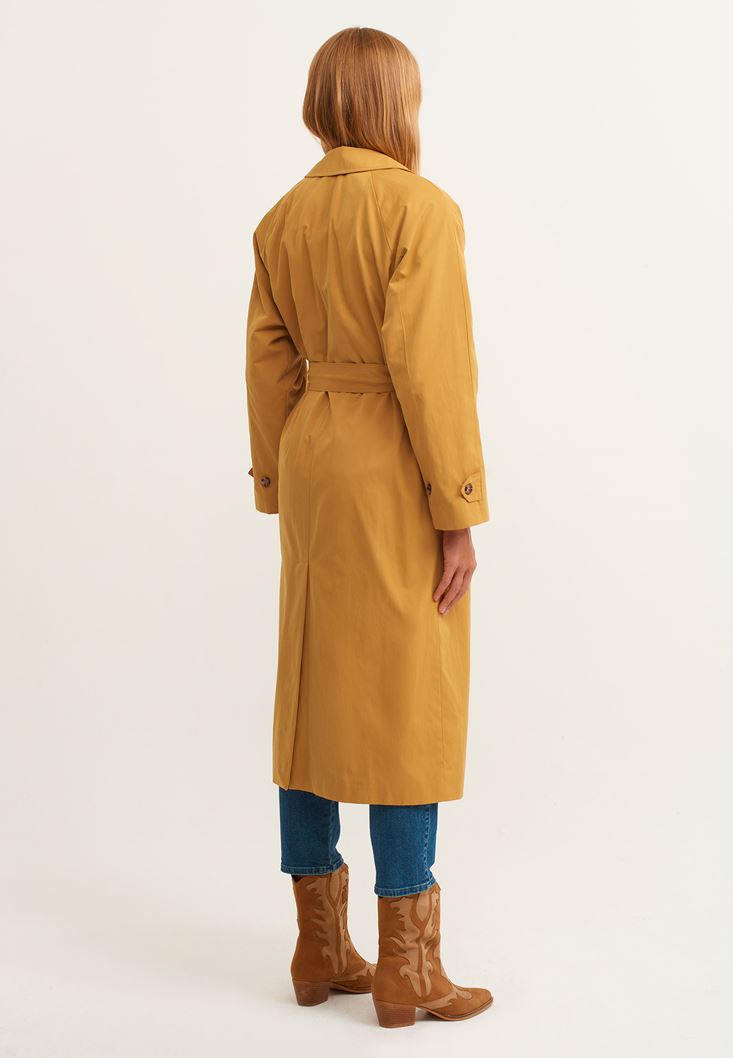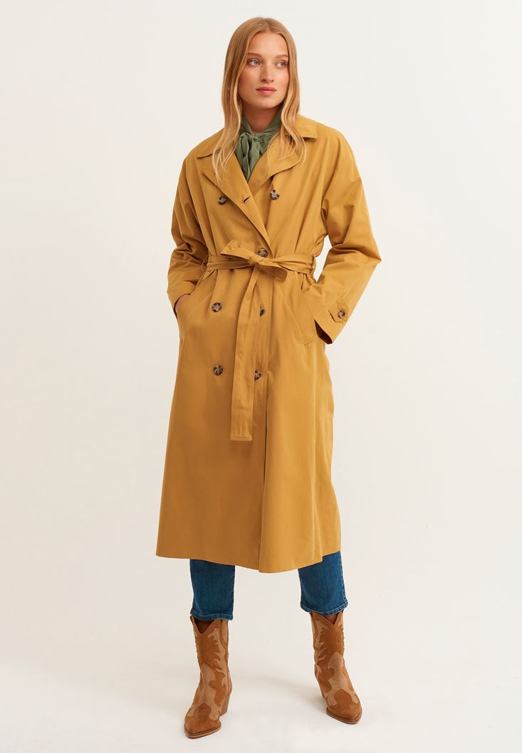 Pamuk karışımlı doku, bedenden uzak oversize-fit, kendi kumaşından kuşaklı, iki cepli, çift düğmeli tasarım, midi boy.