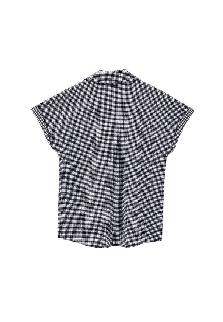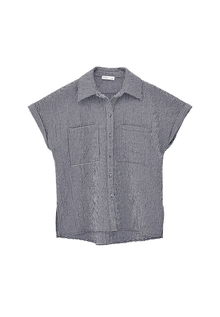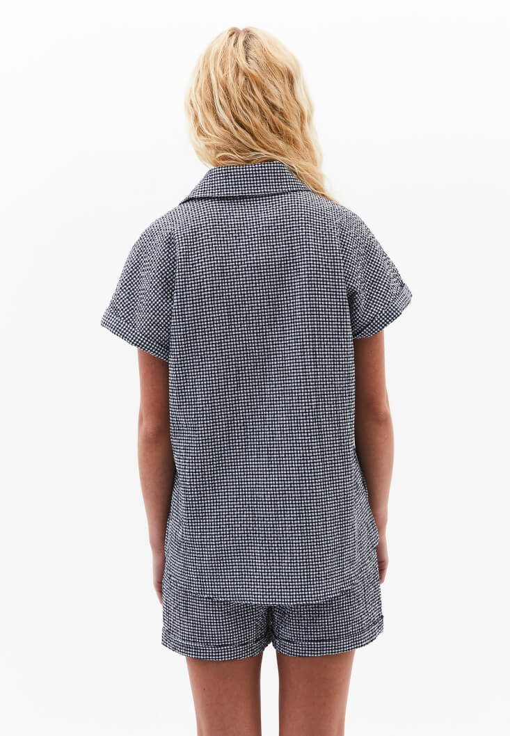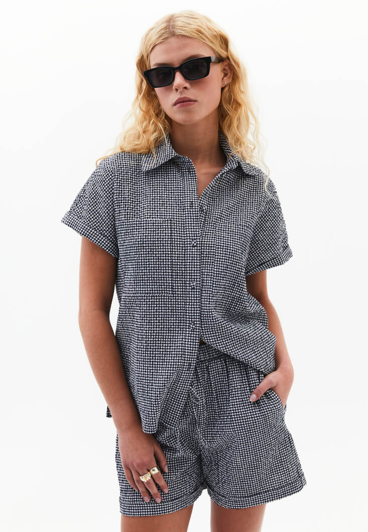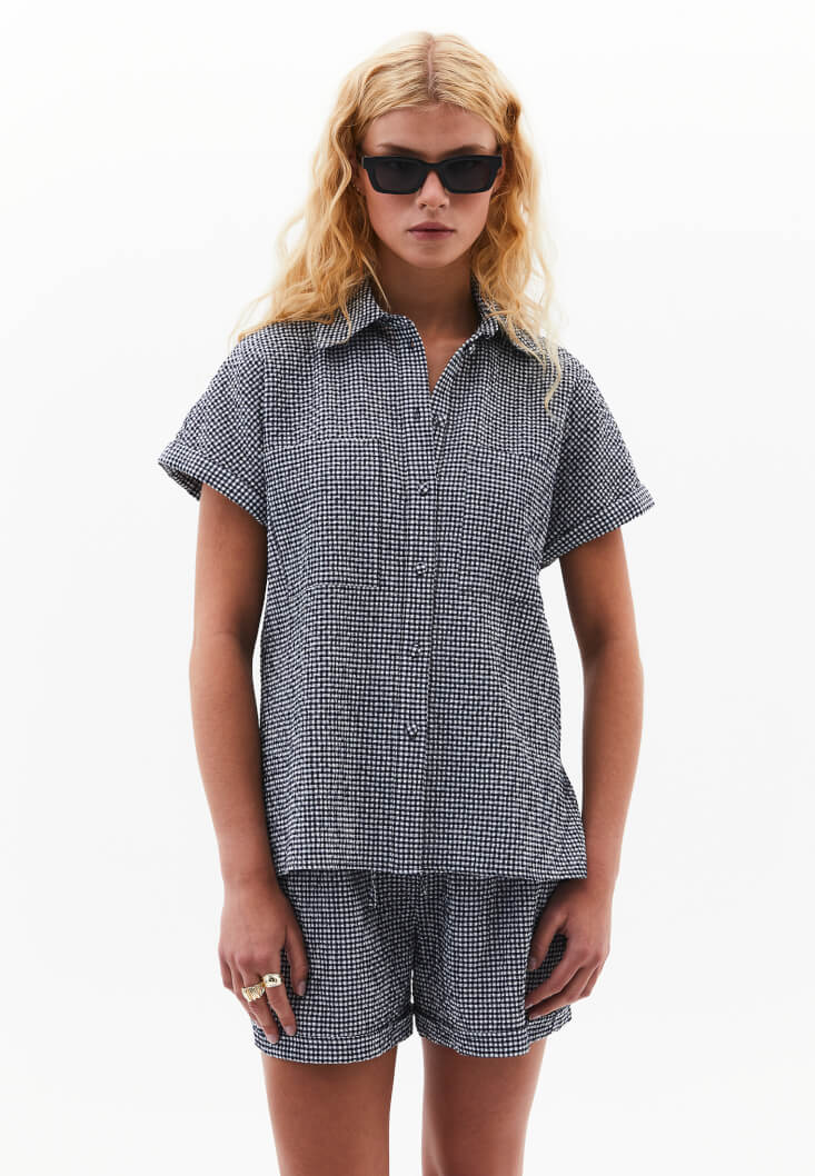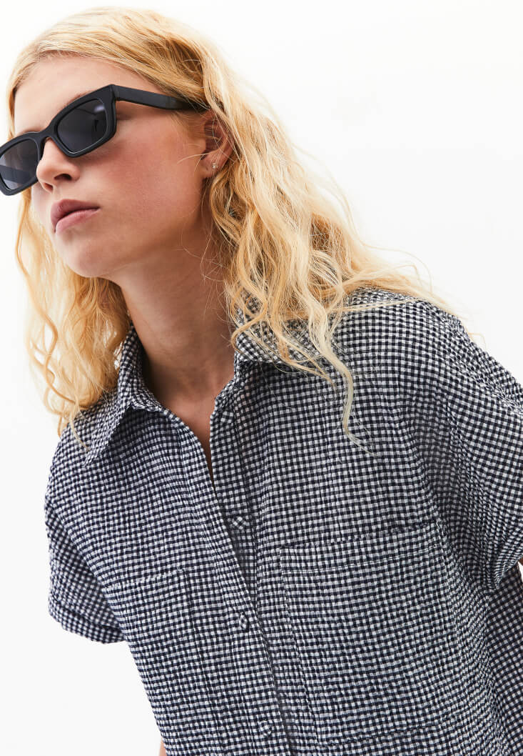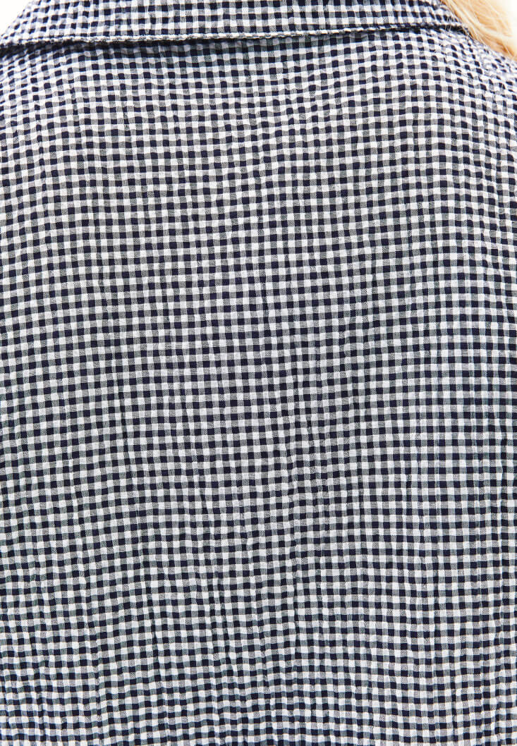 Pamuk karışımlı doku, pötikareli desen, bedenden uzak rahat fit, kısa kollu, düğme kapamalı, kol ucu kıvırma detaylı, önü kısa arkası uzun asimetrik kesim, iki yanı yırtmaçlı, üst beden bölümü iki cepli.