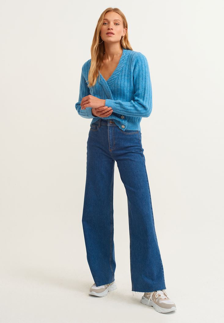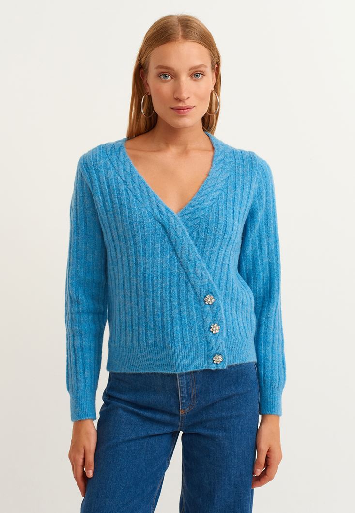 Özel yumuşak dokulu triko, geniş fitilli örgü, kruvaze yaka, taş detaylı 3 düğme, uzun kollu, standart boy, kruvaze yaka boyunca saç örgü detaylı.