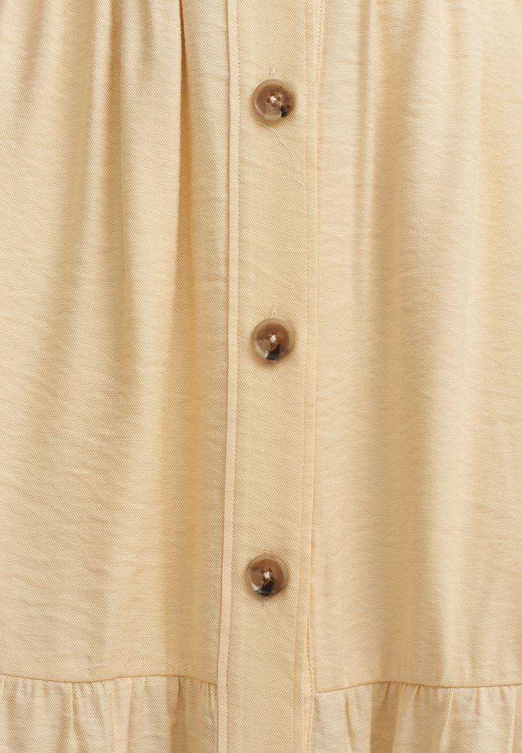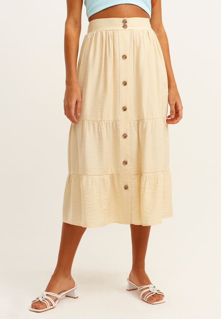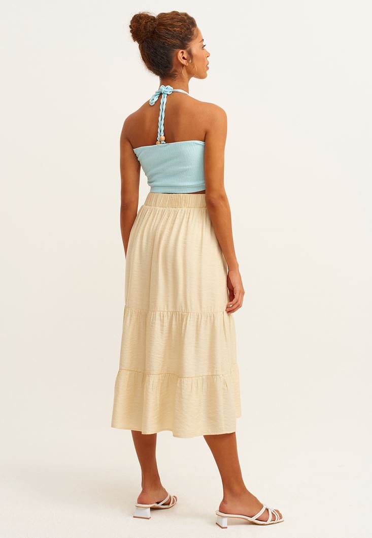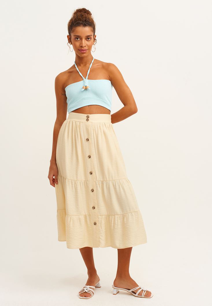 Viskon karışımlı doku, yüksek bel ve midi boy, katlı volanlı görünüm, ön kısmı düğme kapamalı, beli çift düğmeli, arka bel lastikli.