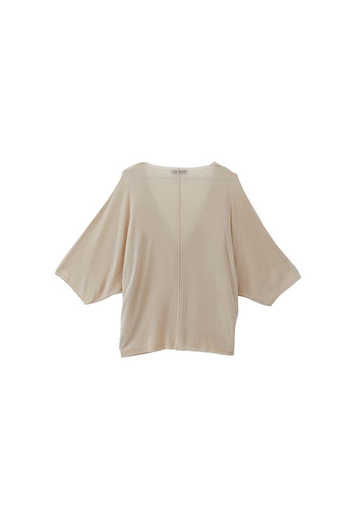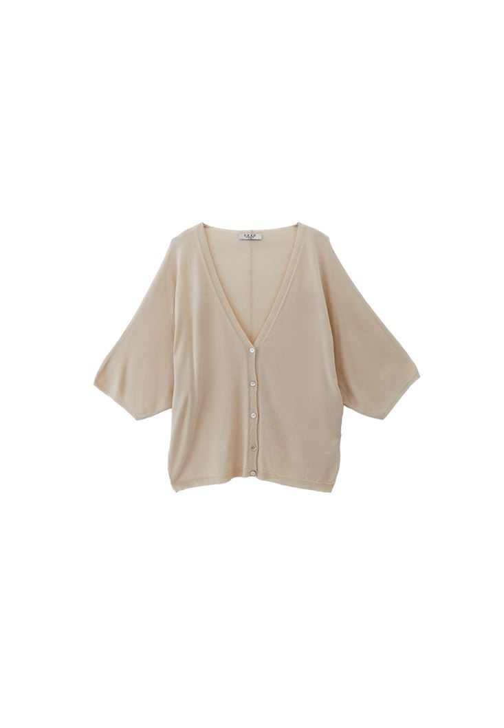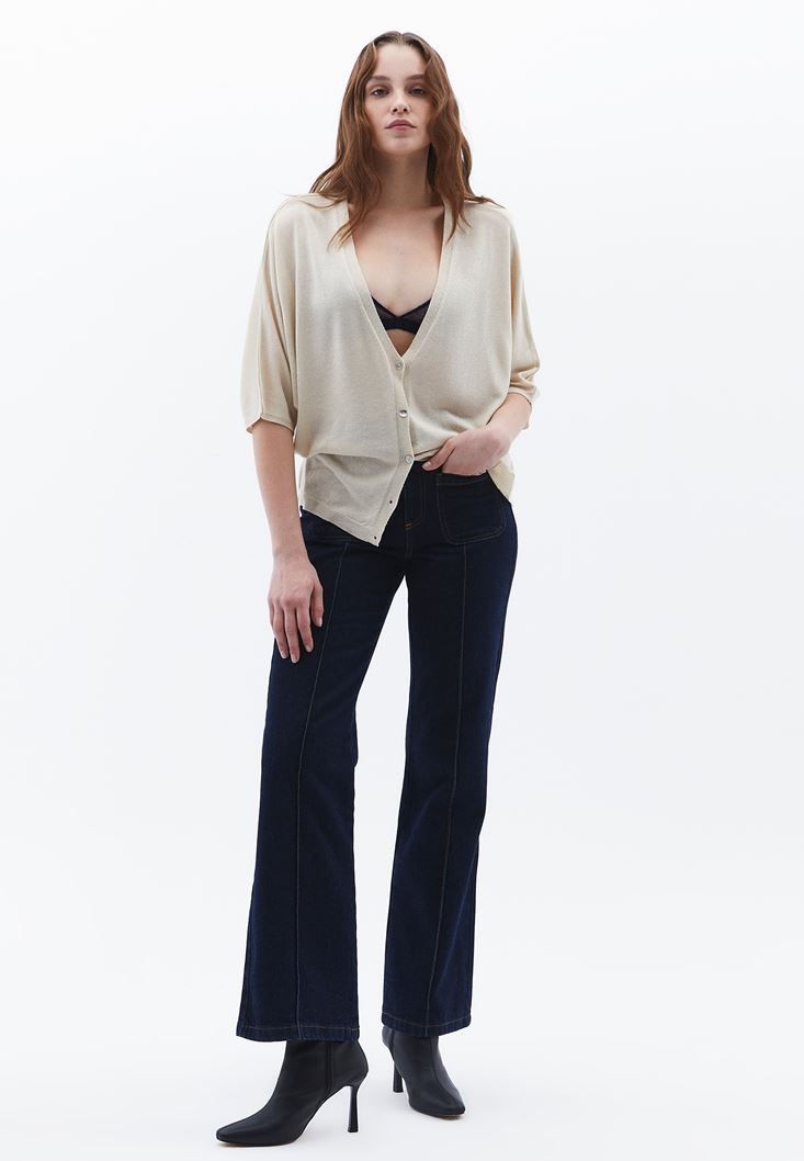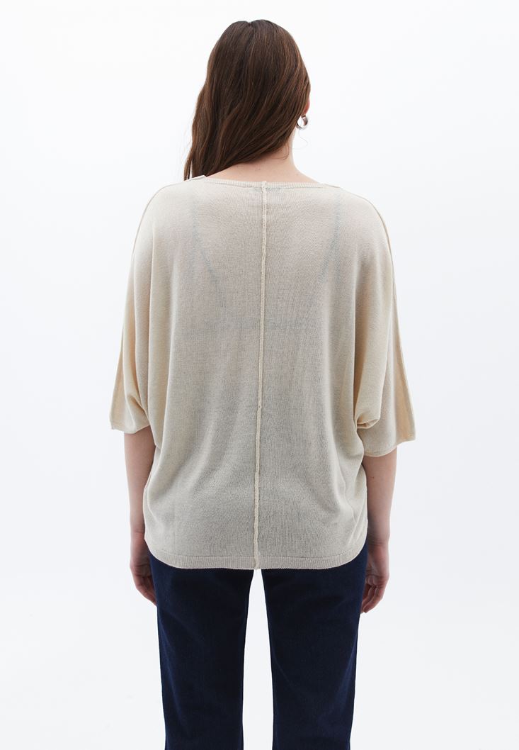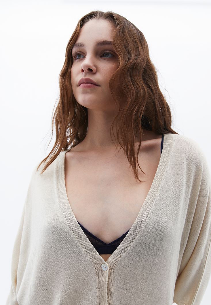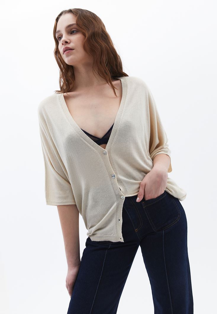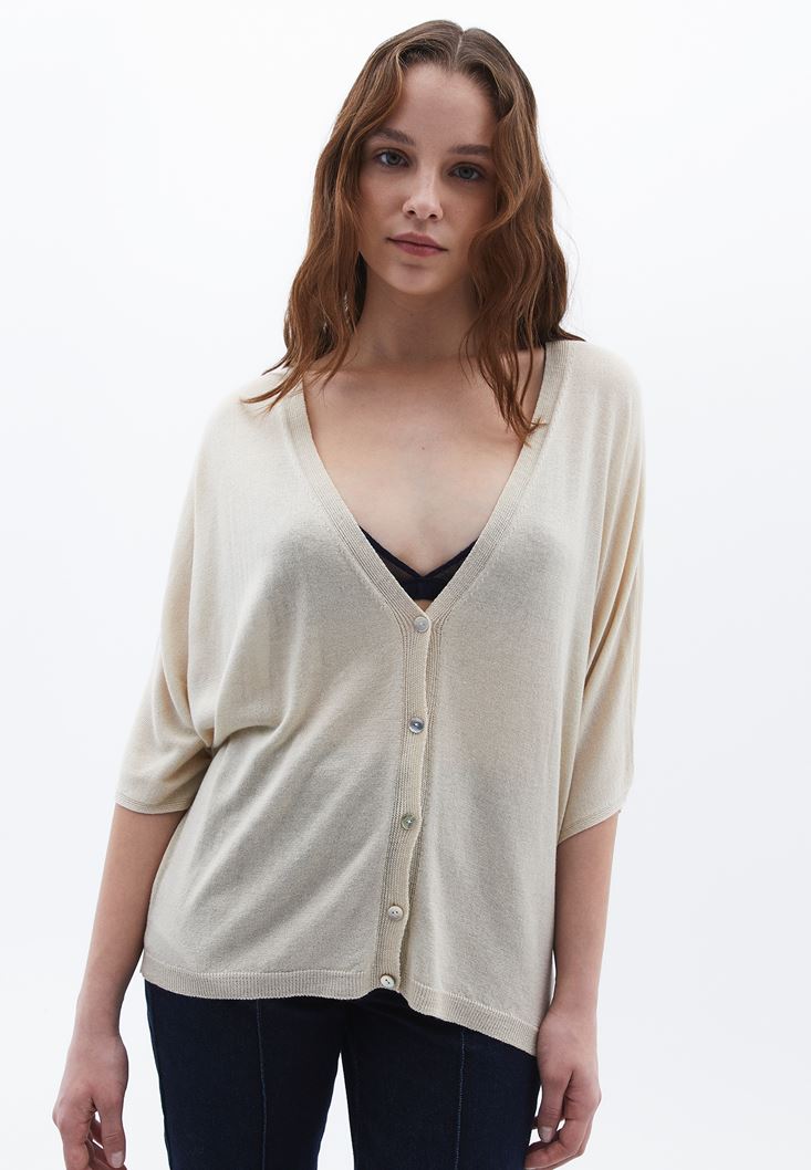 Viskon karışımlı triko, V yaka, bedenden uzak loose fit, kısa kollu, düğme kapamalı, yumuşak triko doku.