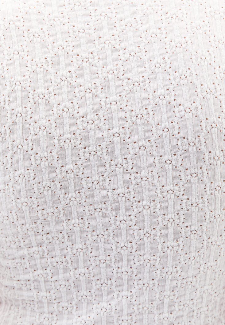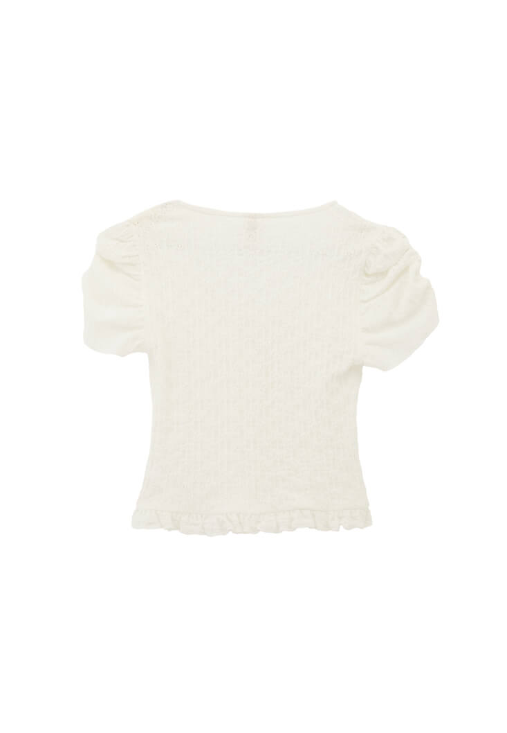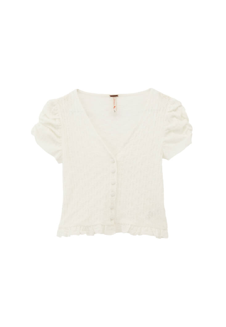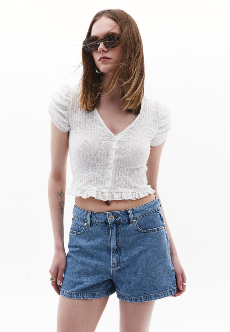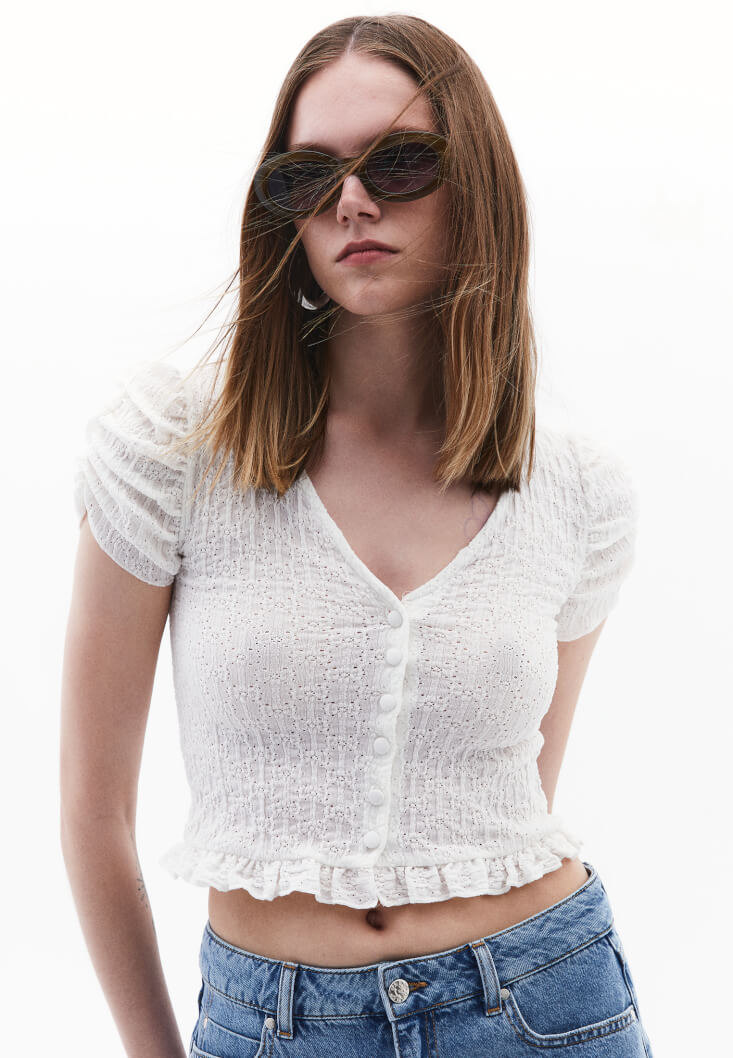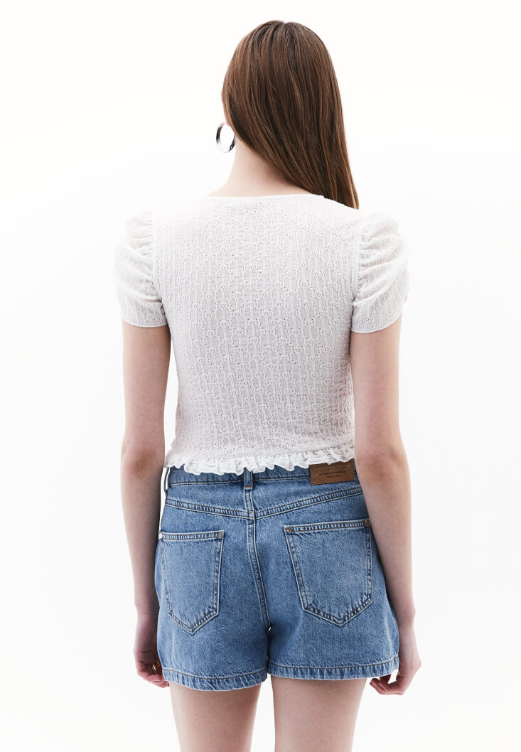 Pamuk karışımlı örme doku, bedeni saran esnek fit, kısa kollu, V yaka, düğme detaylı, kol kısımları büzgü detaylı, crop kesim, beli fırfırlı.
