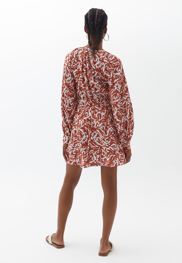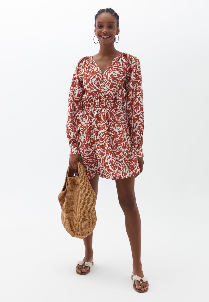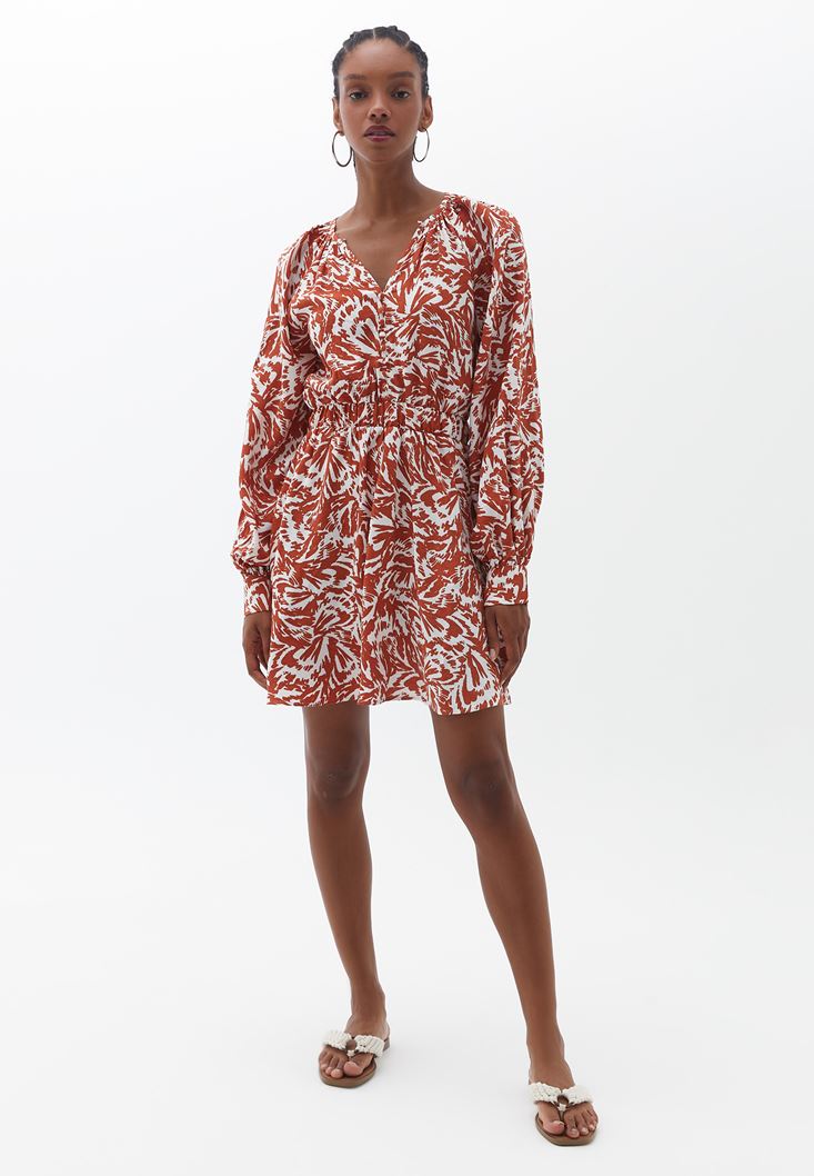 %100 viskon içerikli doku, desenli tasarım, V yaka, ön kısmı düğme kapamalı, beli lastikli, mini boy, uzun kollu, yakası büzgülü.