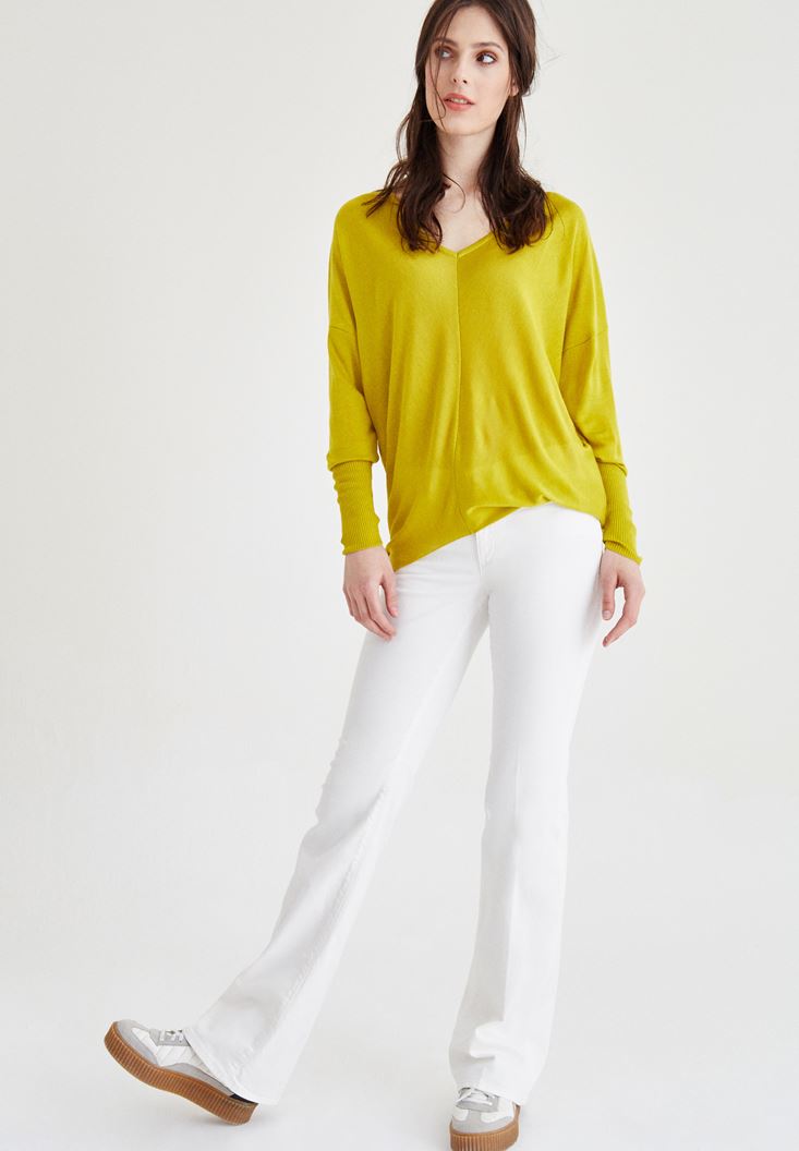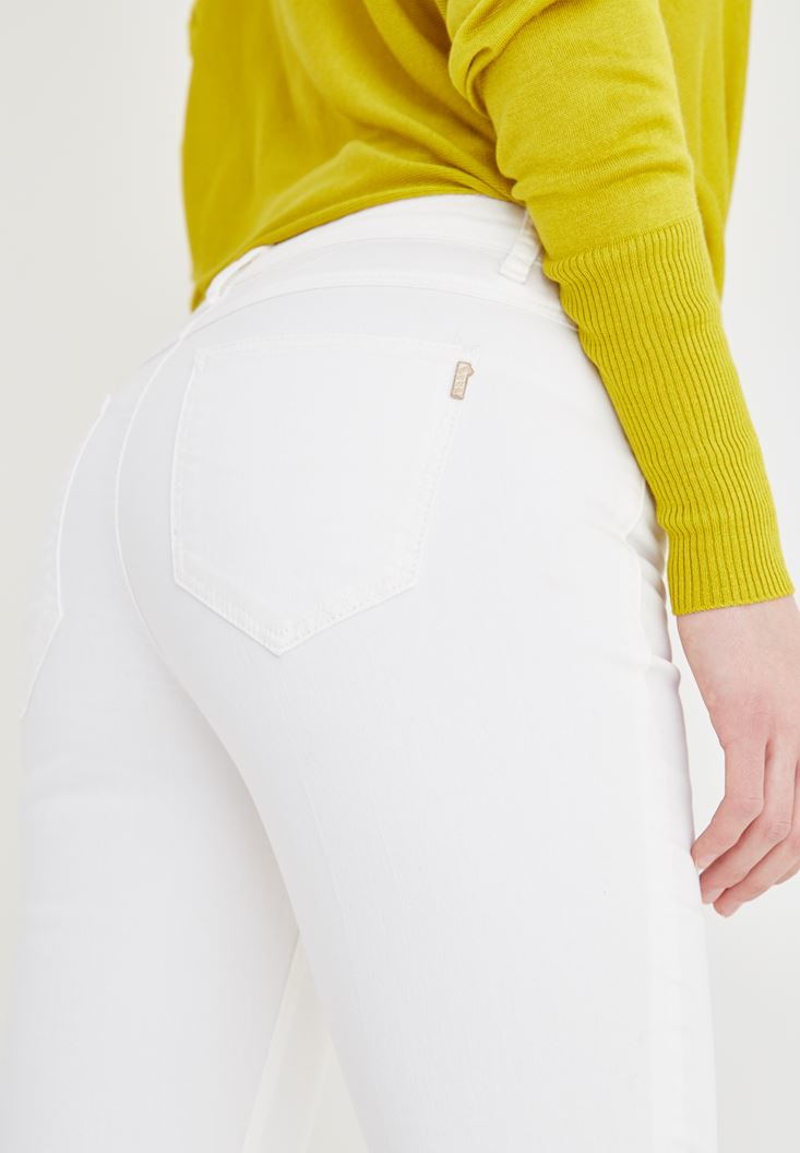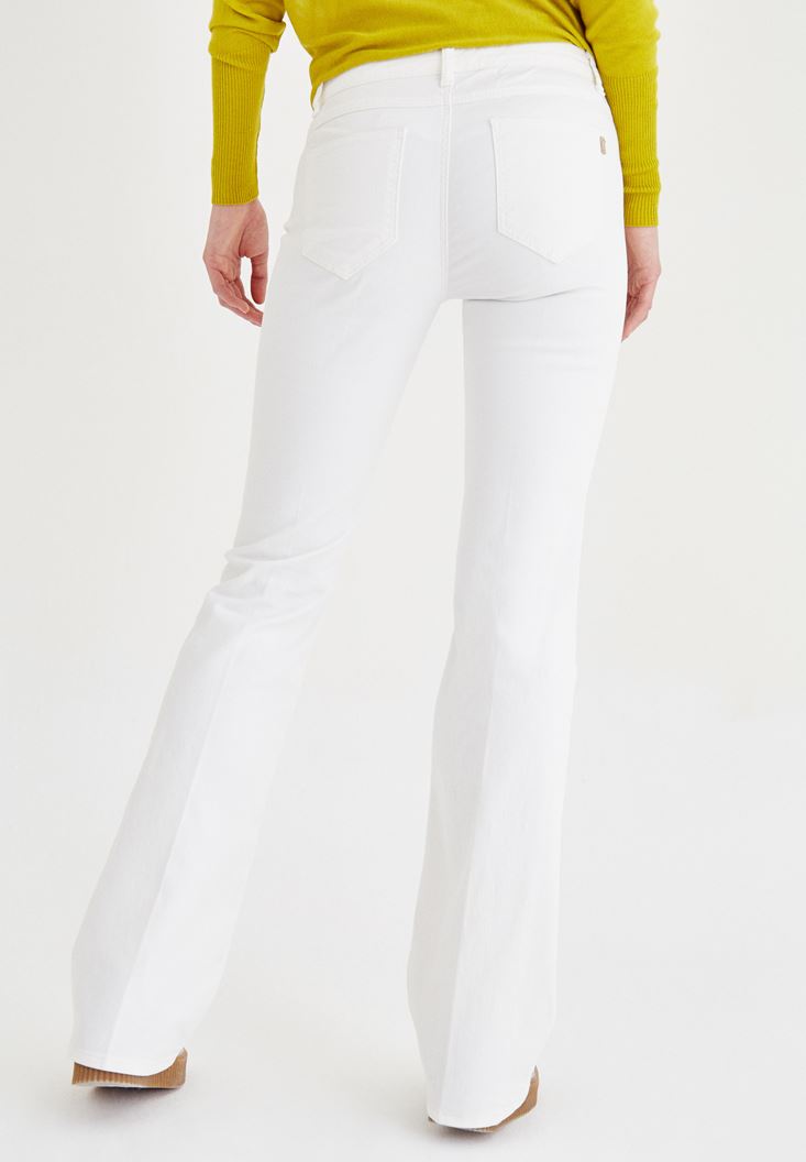 • Bayan Krem Düşük Bel Bot Paça Pantolon