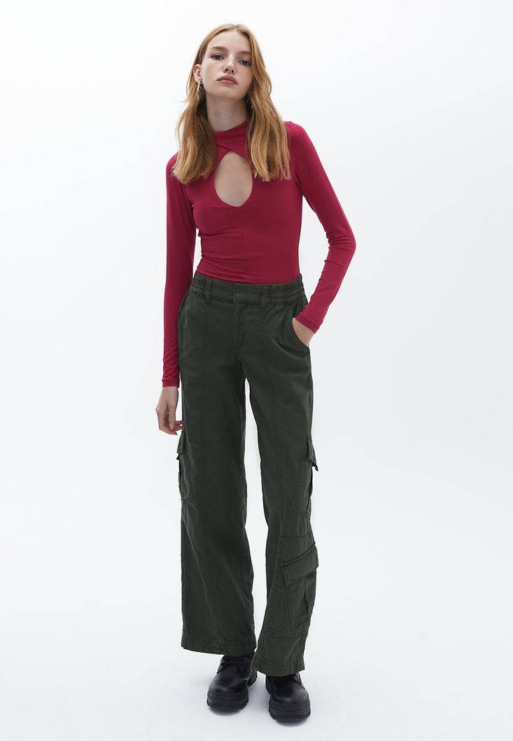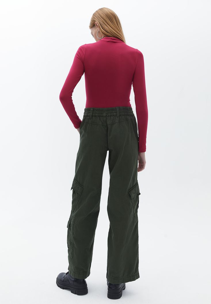 Yeşil Düşük Bel Wide-Leg Kargo Pantolon