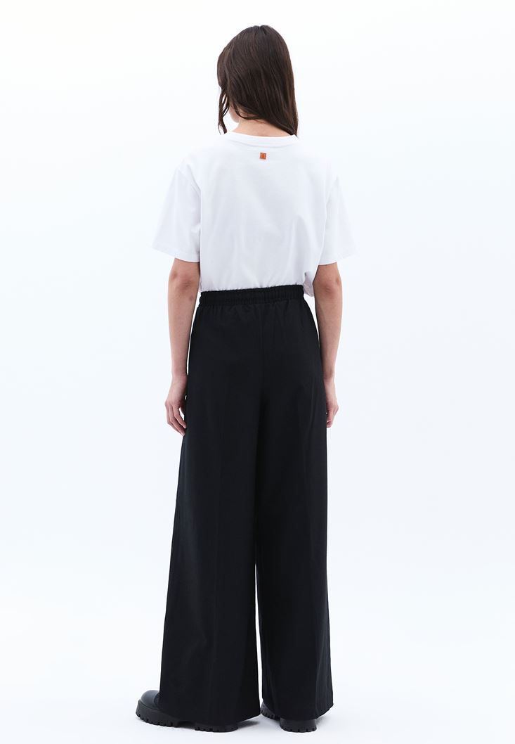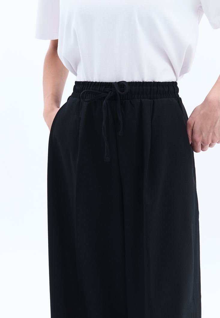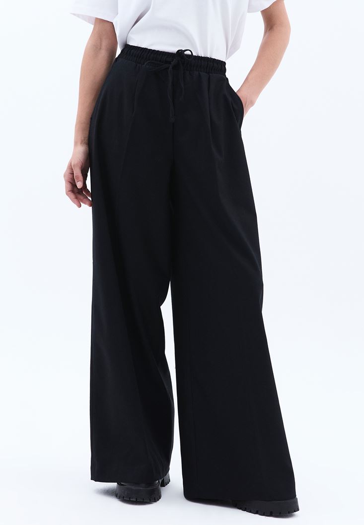 Viskon karışımlı özel doku, düşük bel, beli lastikli ve bağcıklı, bol paça, bedenden uzak baggy fit, iki cepli.