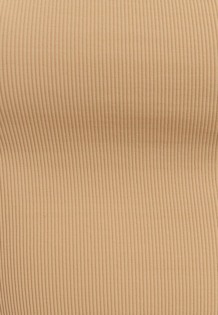 Yumuşak ve esnek özel doku, ön kısmı cut-out detaylı, crop kesim, bedeni saran rahat kalıp, düşük omuz tasarımlı, kısa kollu.