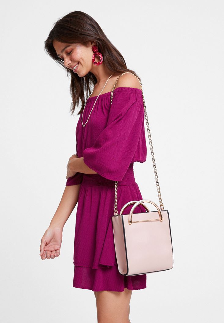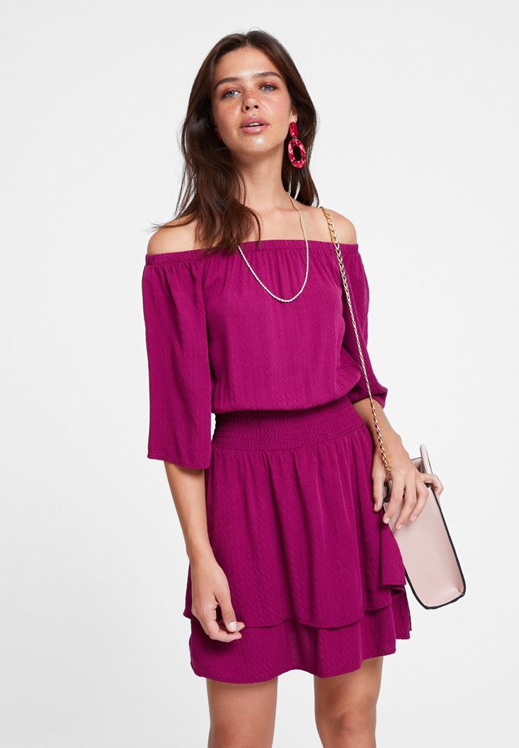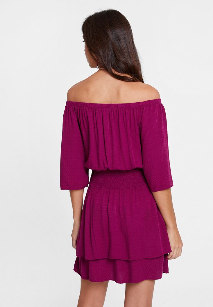 • Bayan Mor Düşük Omuzlu Dokulu Elbise