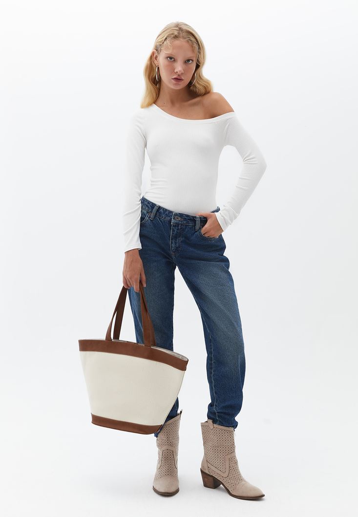 • Bayan Krem Düşük Yaka Uzun Kollu Tişört