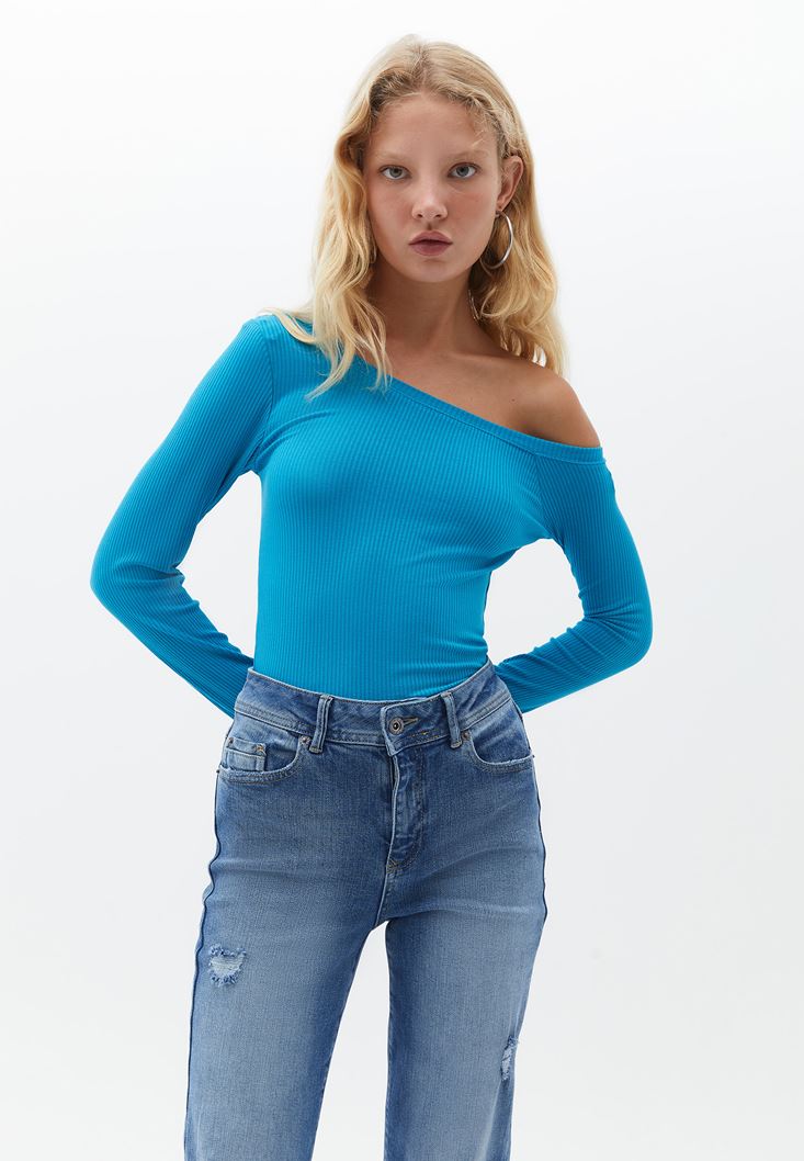 • Bayan Mavi Düşük Yaka Uzun Kollu Tişört