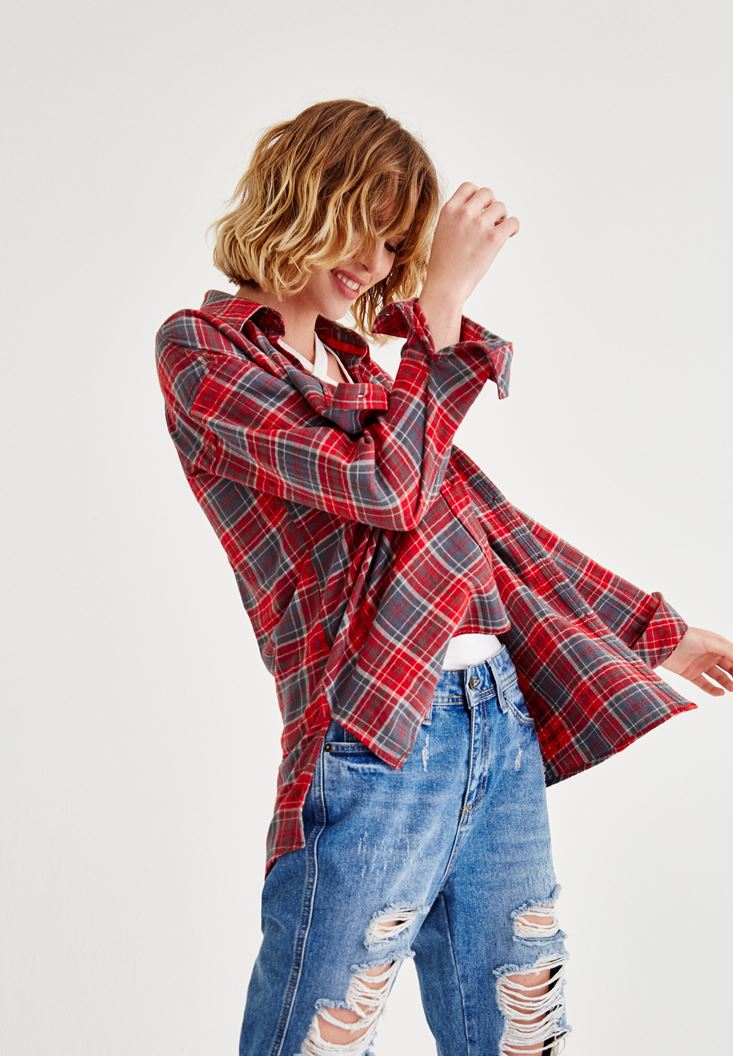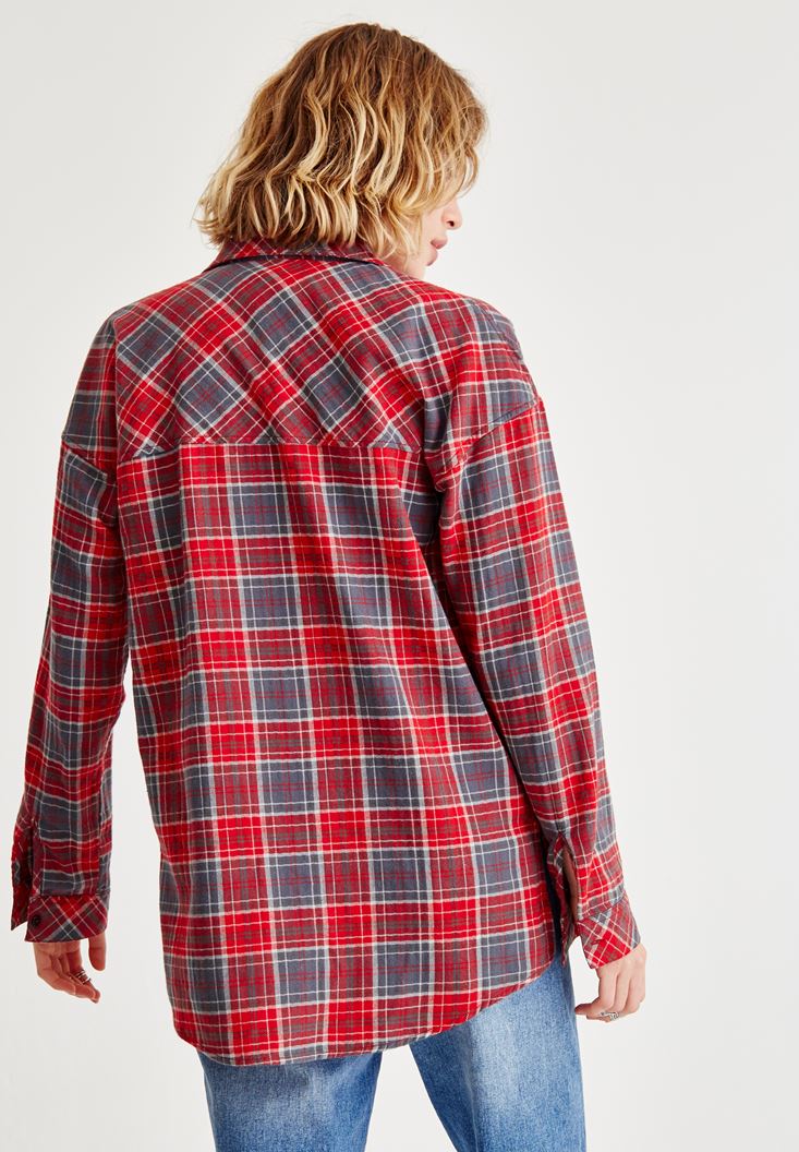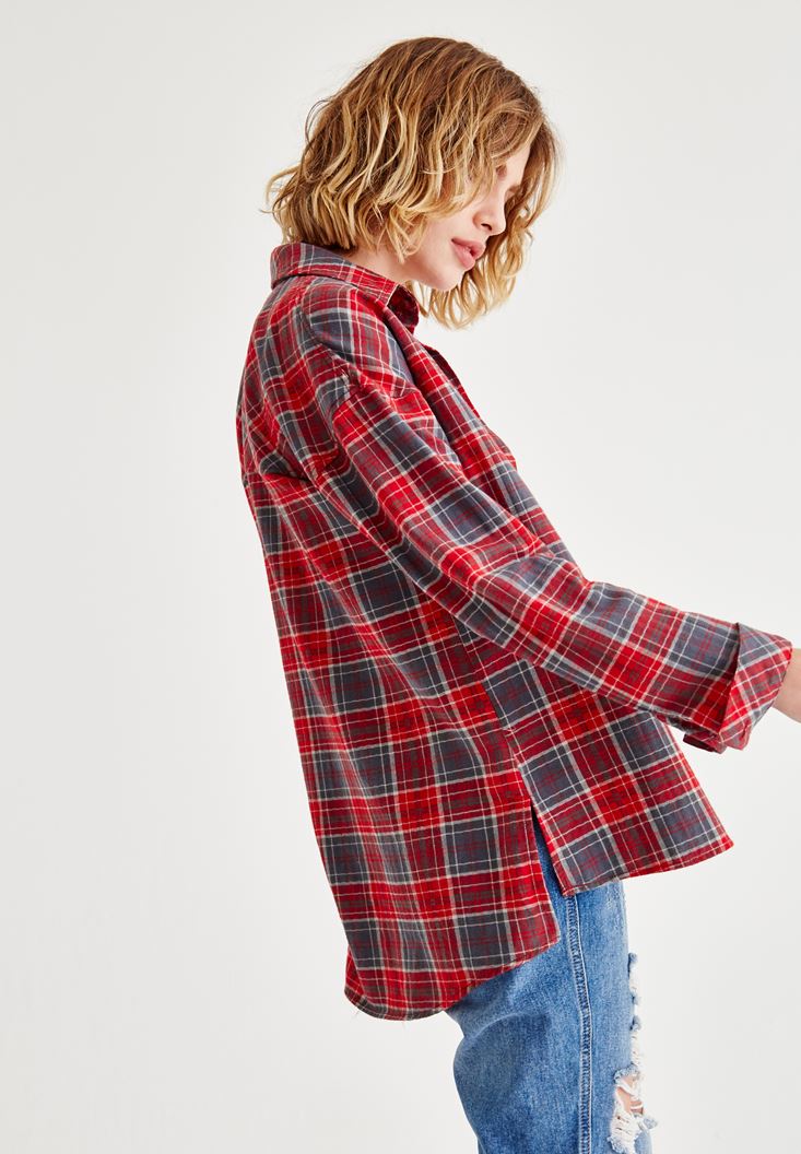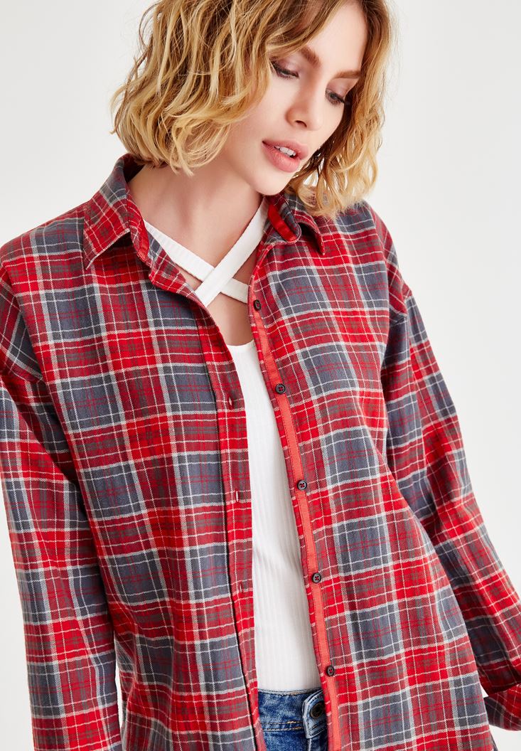 • Bayan Kırmızı Ekose Desenli Bol Gömlek