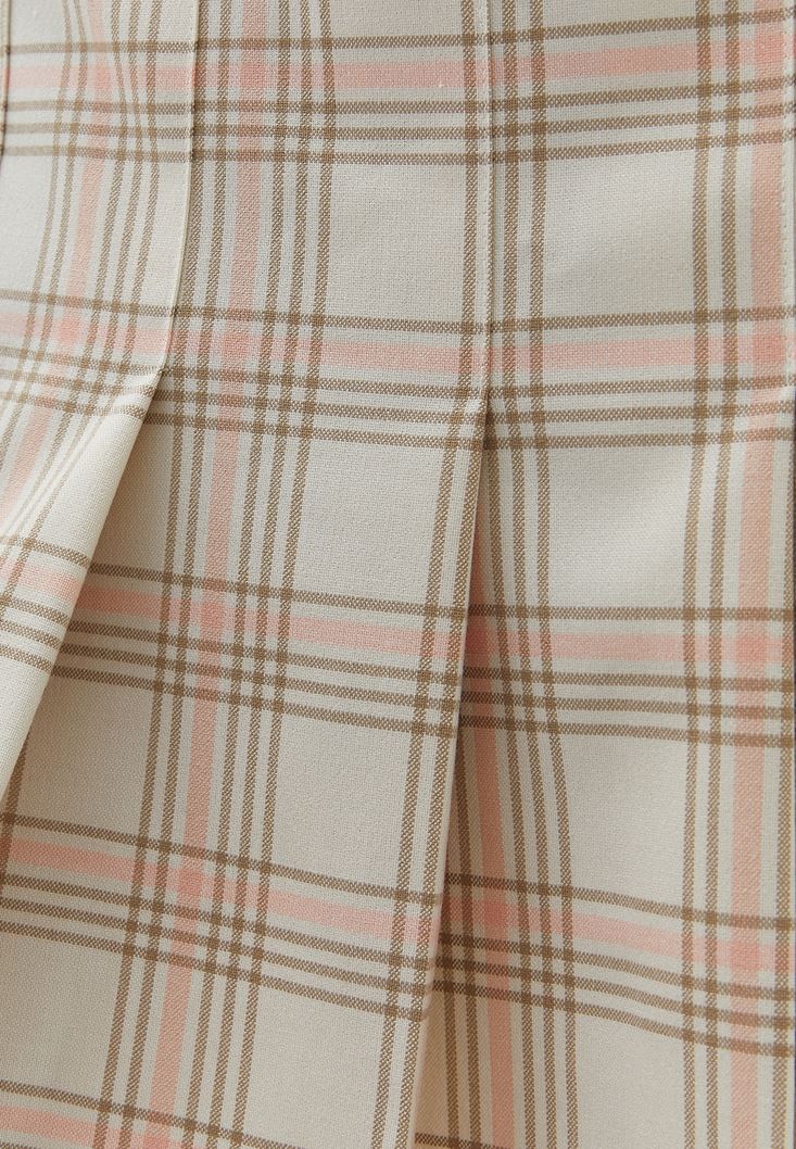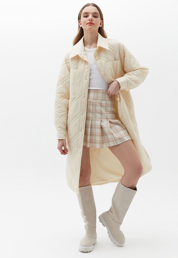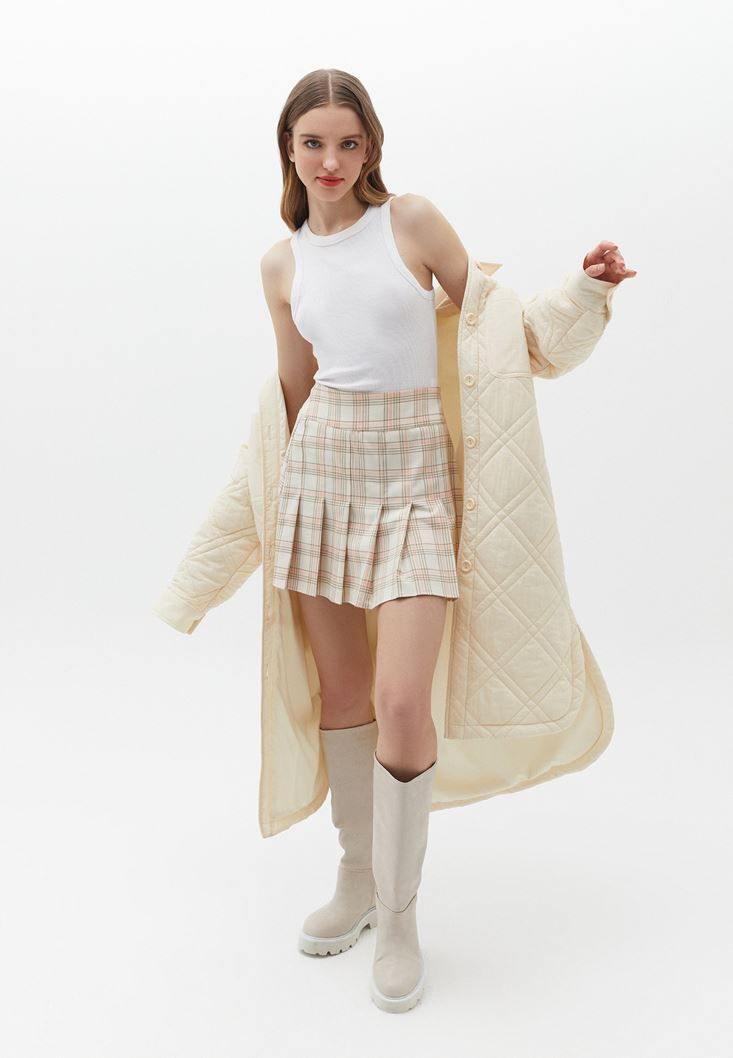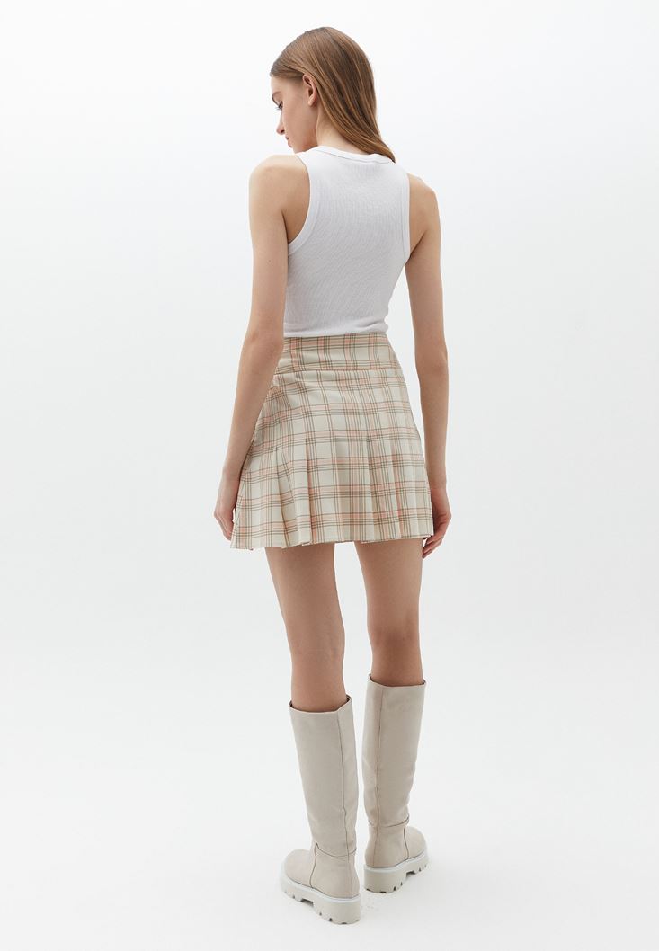 Viskon karışımlı özel doku, ekose desenli, pileli tasarım, mini boy, yüksek bel, A-line kesim, yan kısmı fermuar kapamalı.