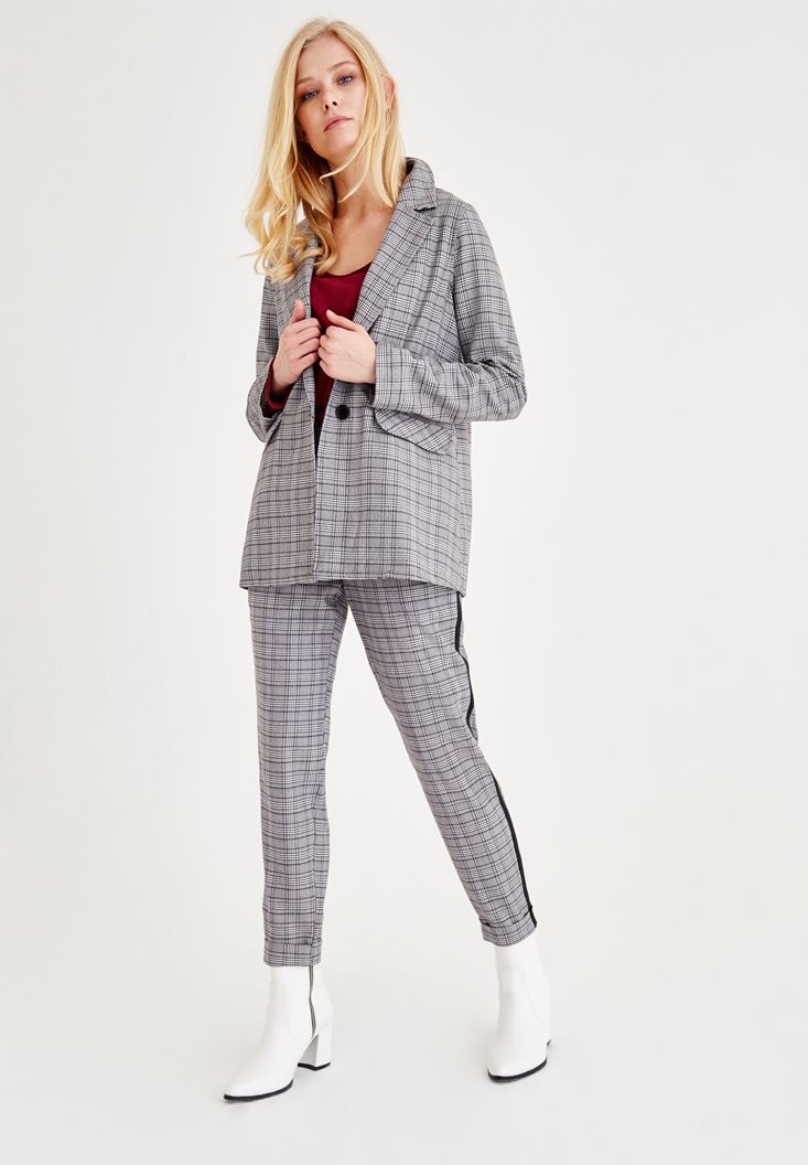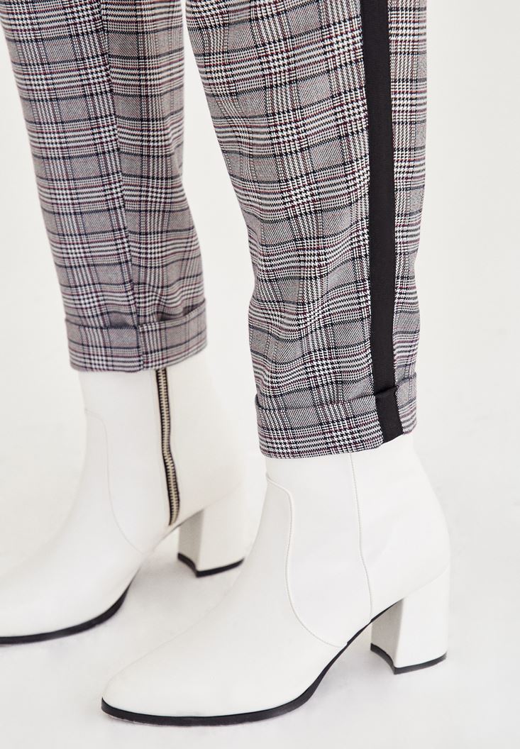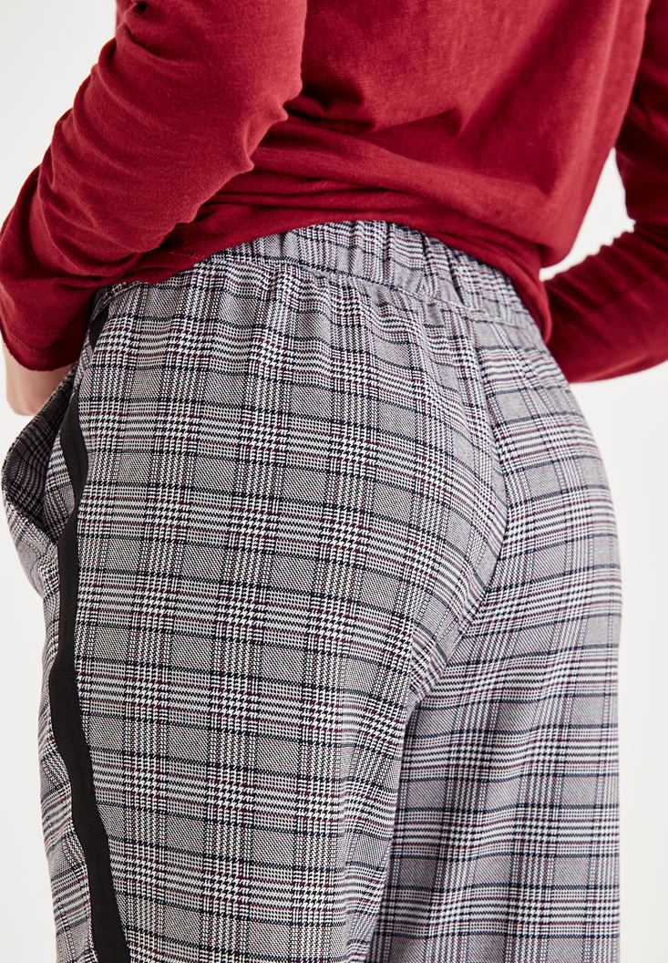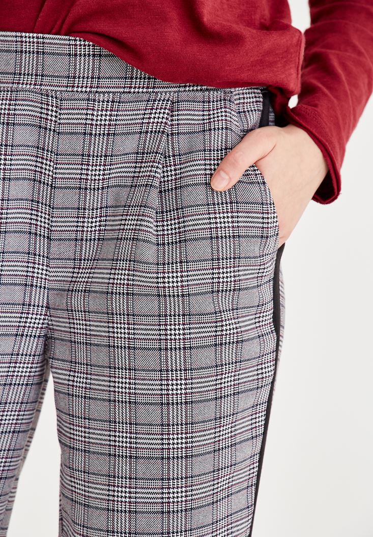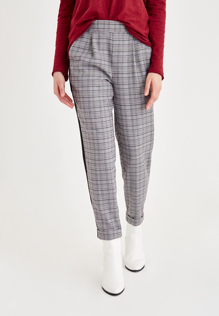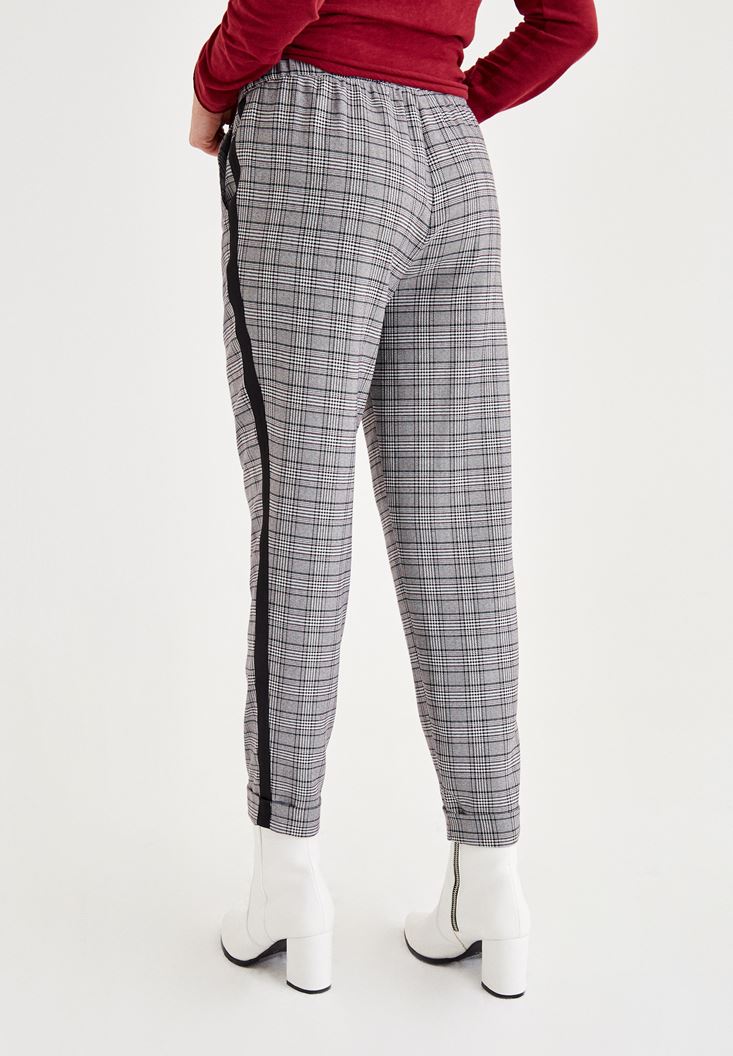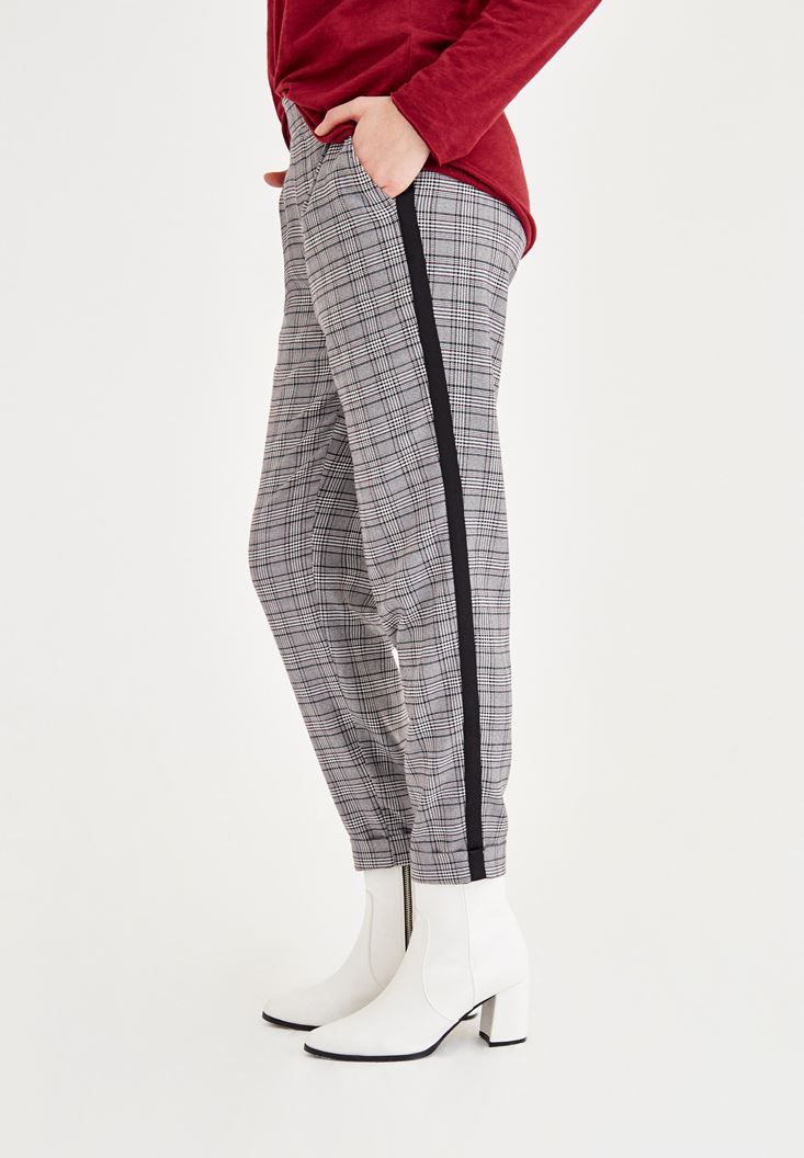 Gri Ekose Desenli Şerit Detaylı Pantolon