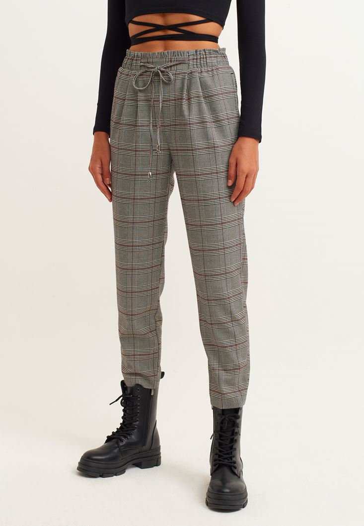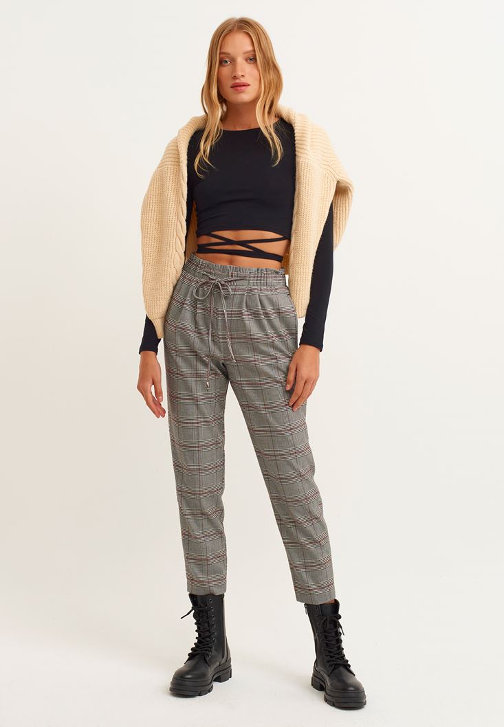 Viskon karışımlı doku, ekose desenli, havuç kalıp, slim paça, beli lastikli ve bağcık detaylı, yüksek bel, bilekte biten paça boyu, bedene yakın rahat fit.