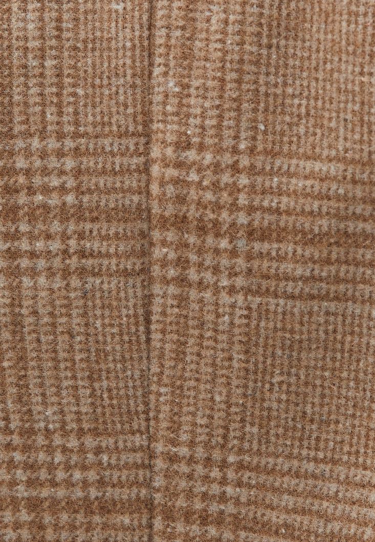 Yün karışımlı doku, ekose desenli, bedene yakın fit, uzun kollu, ön kısmı kapaklı iki cepli, önü düğme kapamalı, uzun boy kesimi.