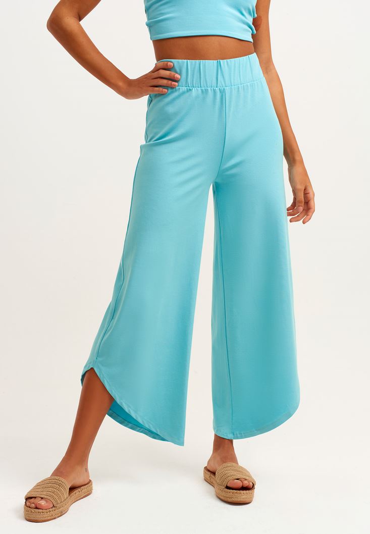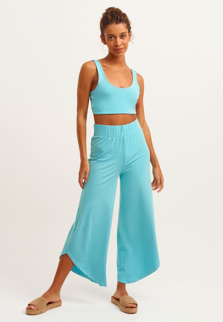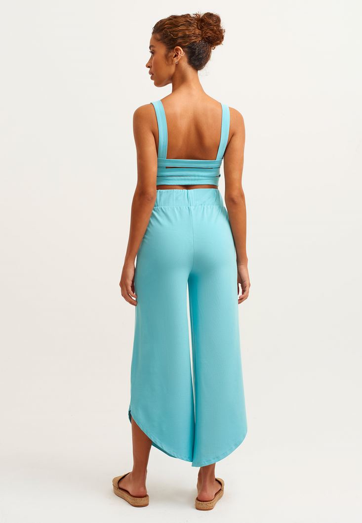 Viskon içerikli ekstra esnek doku, wide-leg asimetrik paça, yüksek bel, bedenden uzak rahat kalıp, beli lastikli.
