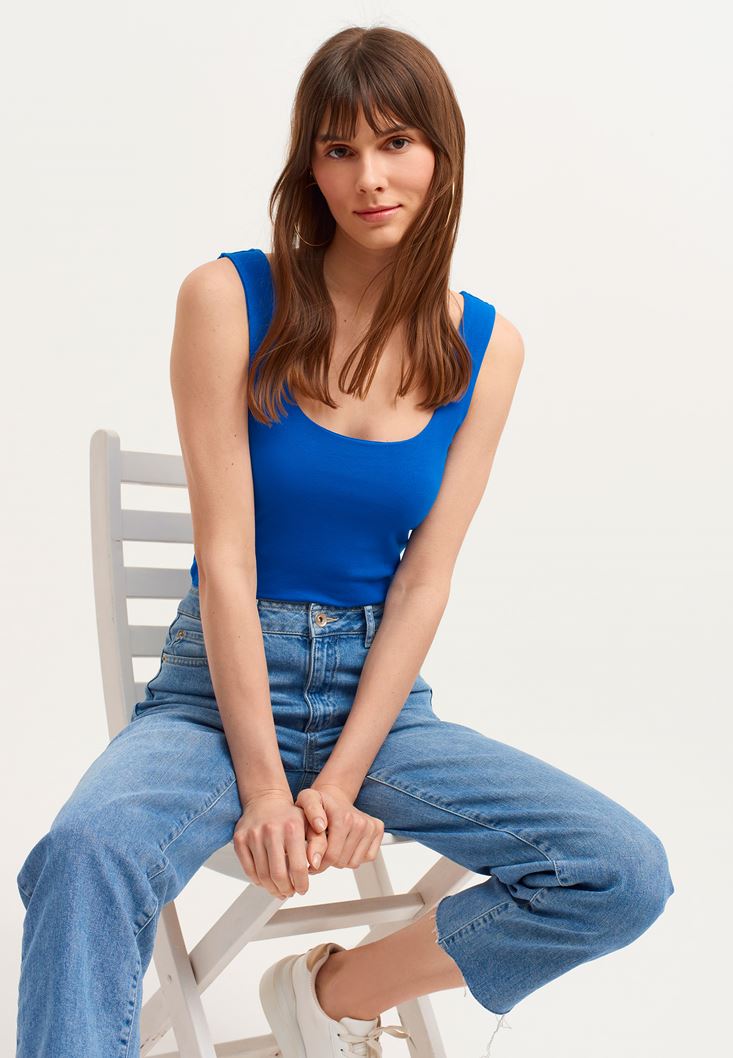 • Bayan Mavi Esnek Dokulu Kare Yaka Atlet