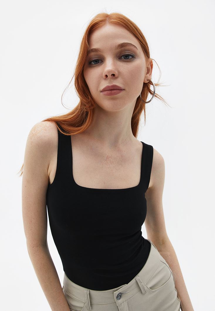 Yüksek pamuk içerikli yumuşak doku, bedeni saran esnek fit, kalın askılı, kare yaka, standart boy, sırt kısmı kare kesim.