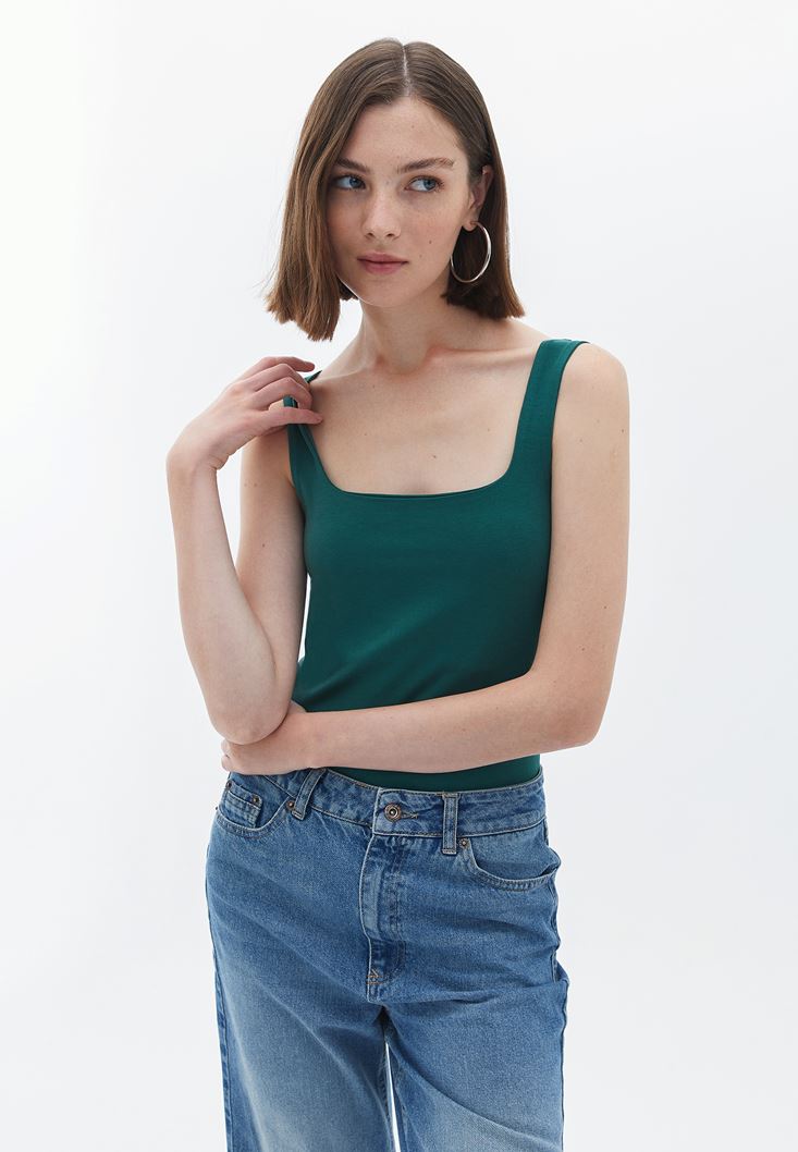 Yeşil Esnek Dokulu Kare Yaka Atlet