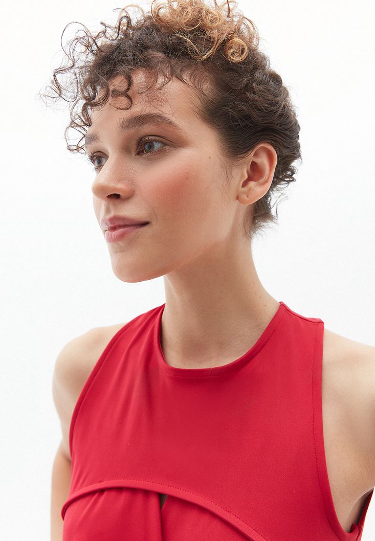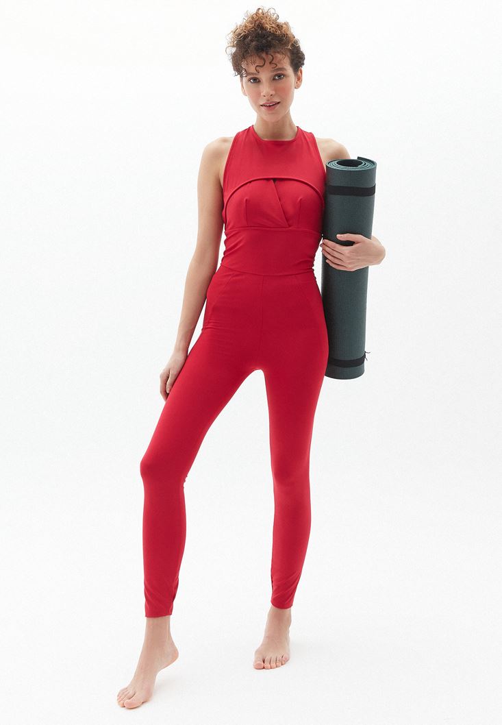 Özel esnek doku, ön kısmı cut-out detaylı, halter yaka, dar paça, bedeni saran esnek fit, sırtı çapraz askı detaylı.