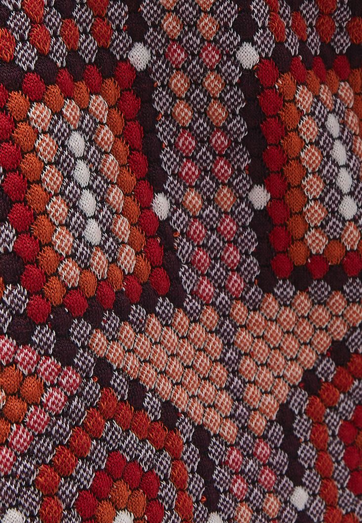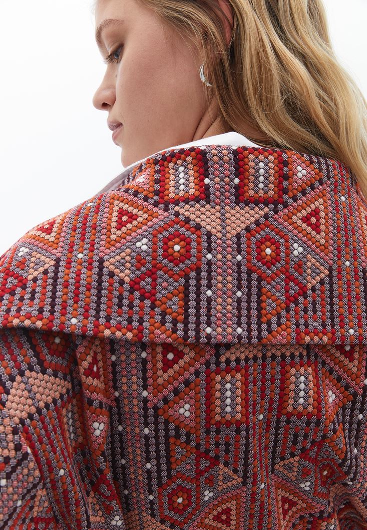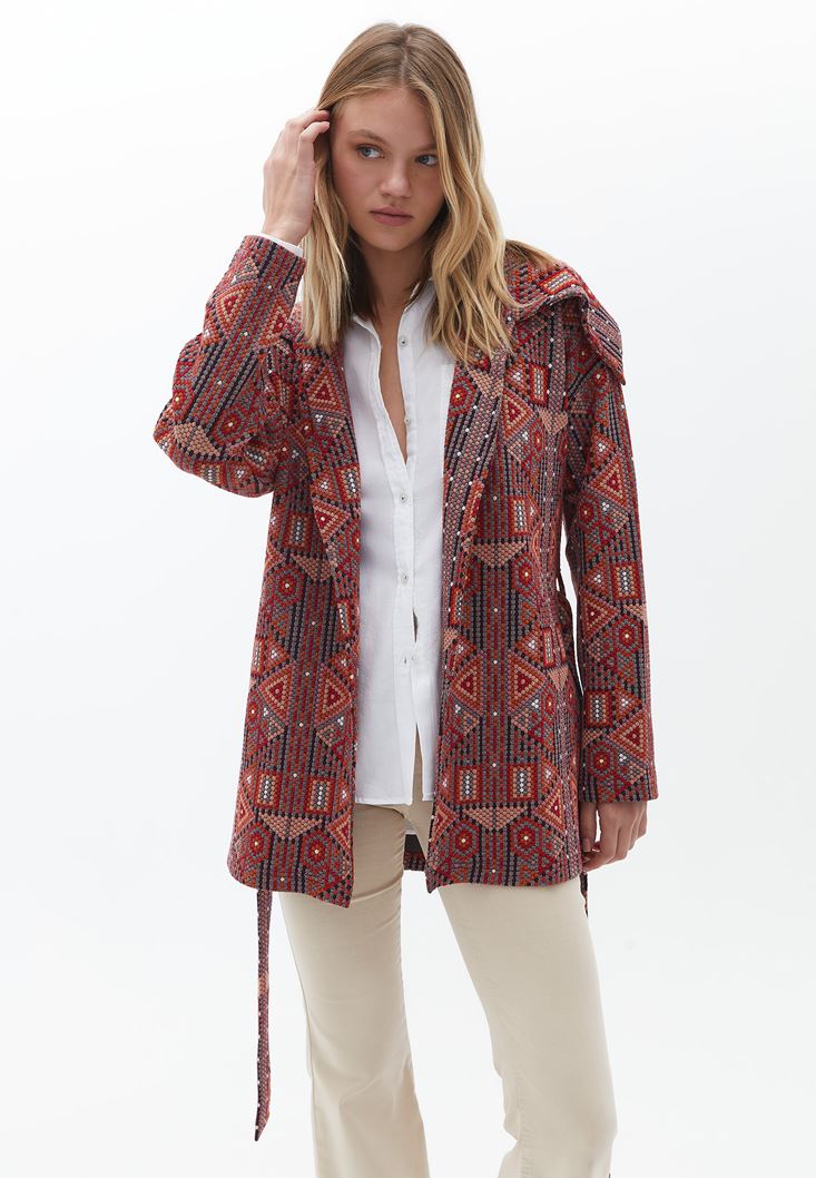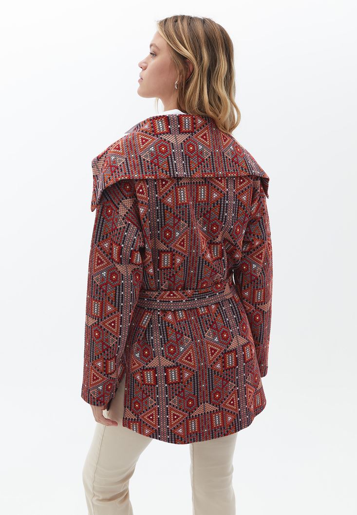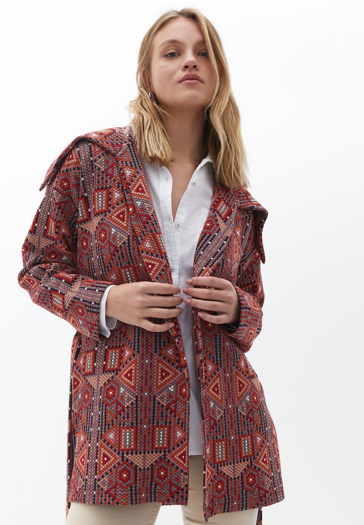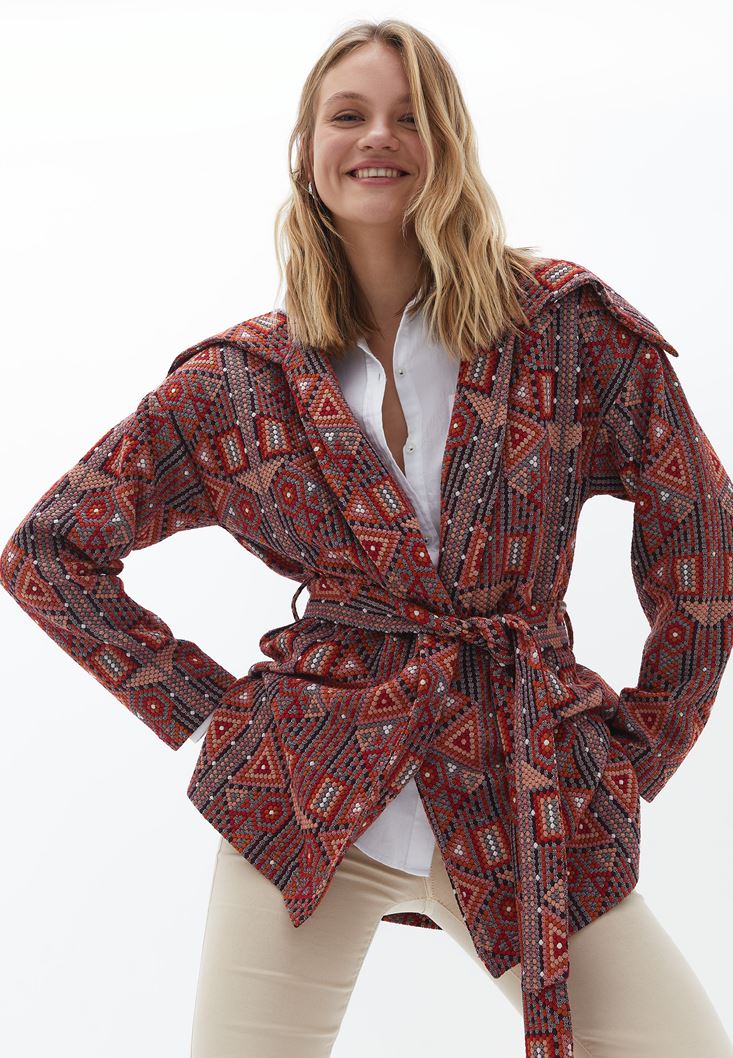 Viskon ve pamuk içerikli doku, etnik desenli, bedenden uzak rahat fit, uzun kollu, şal yaka, kendi kumaşından kuşaklı, tunik boy, önü kısa arkası uzun asimetrik kesim.