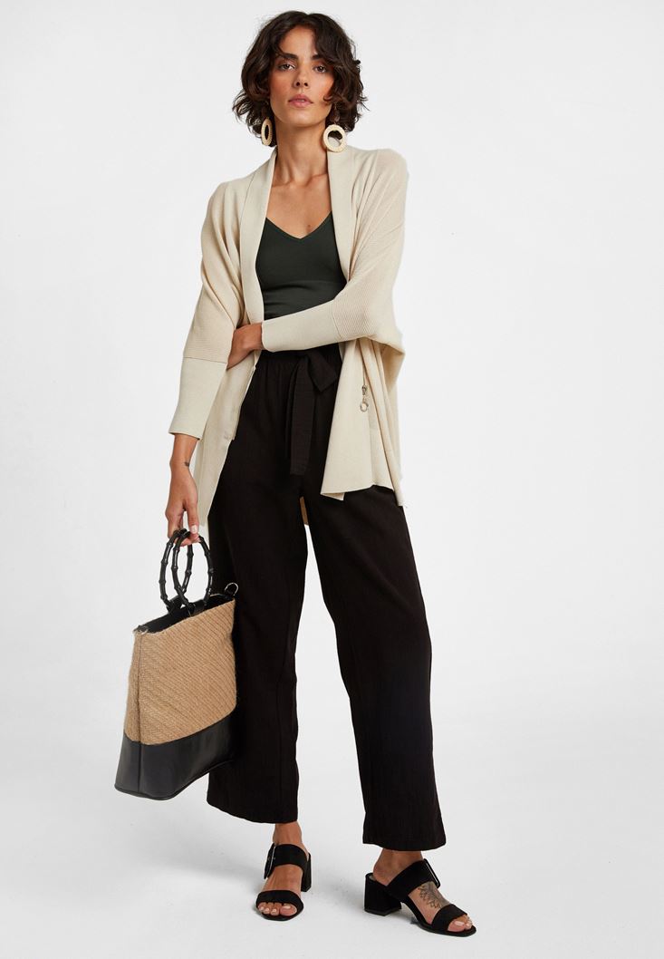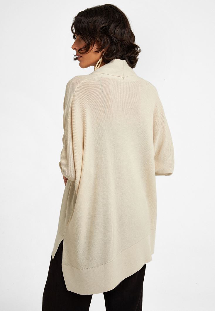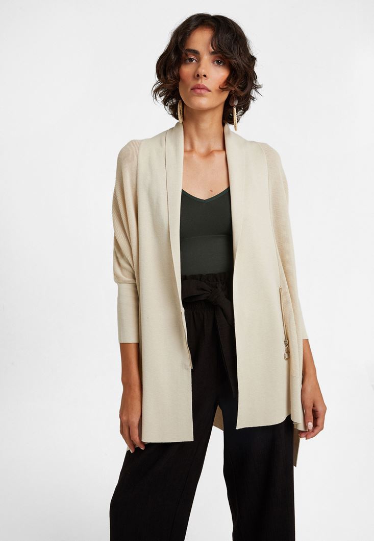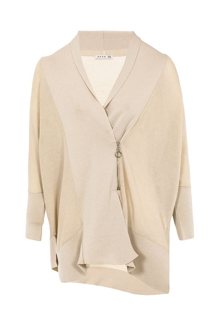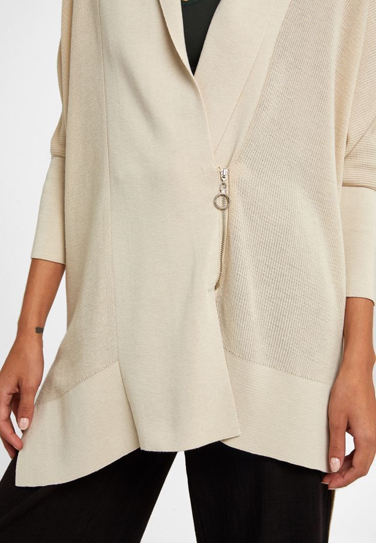 Krem Fermuar Detaylı Asimetrik Hırka
