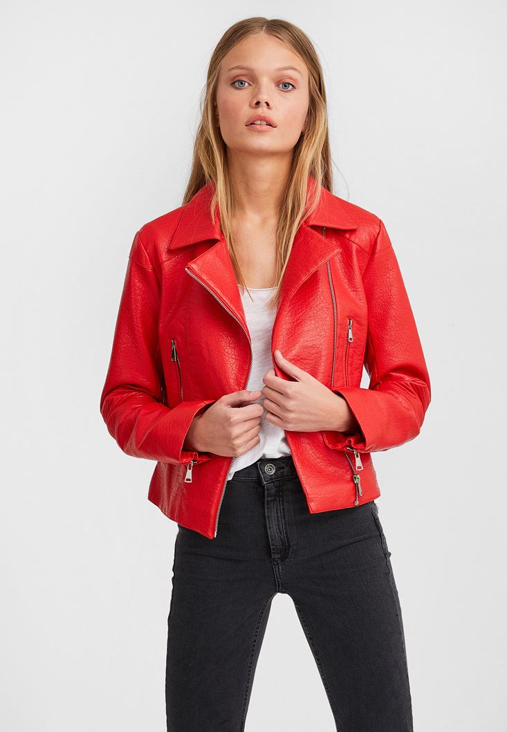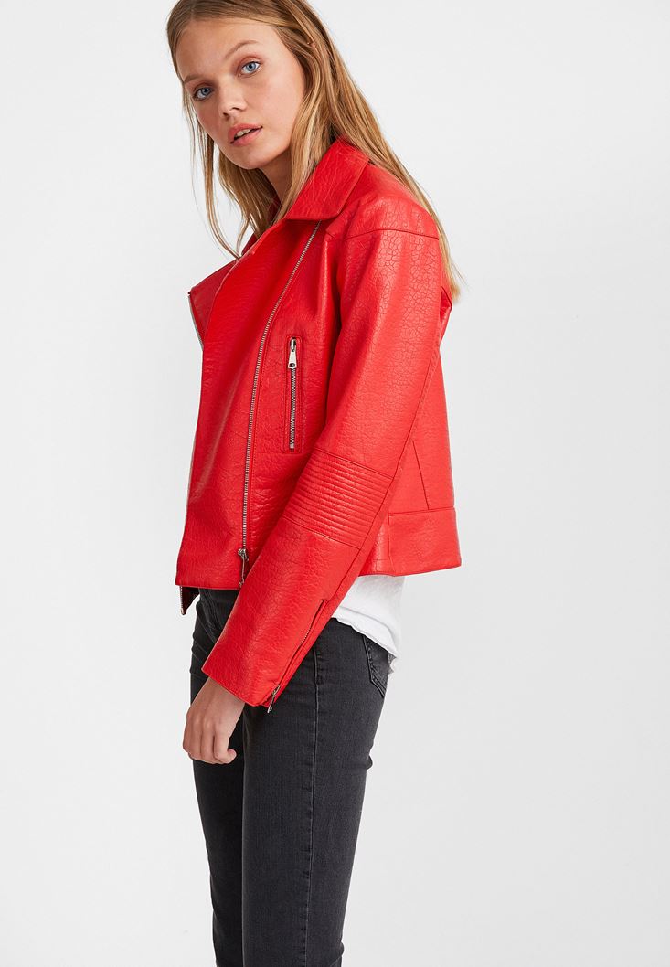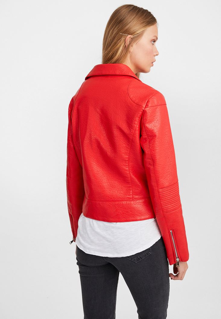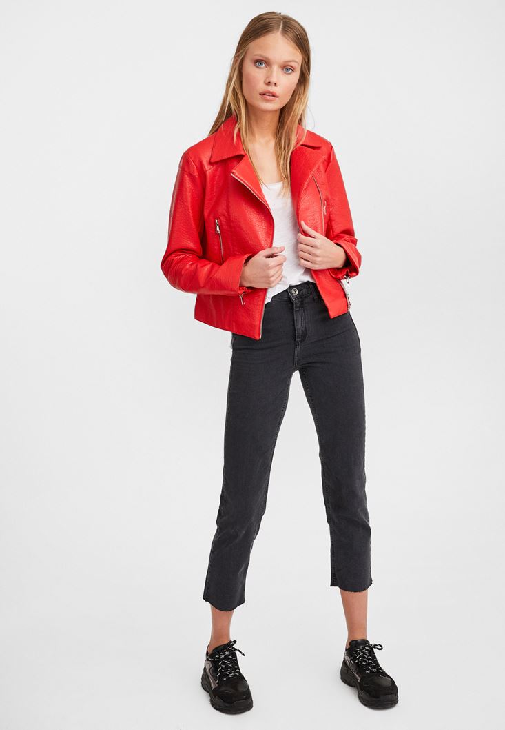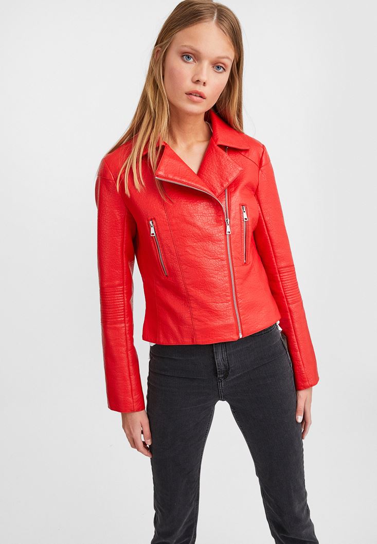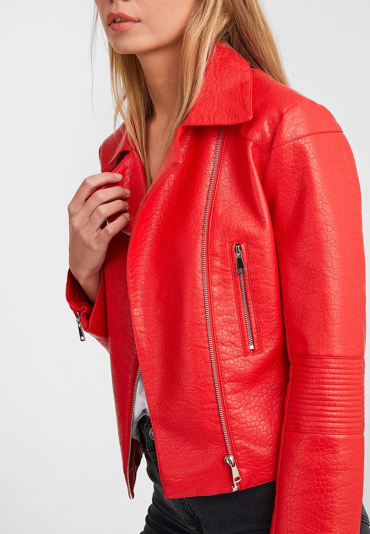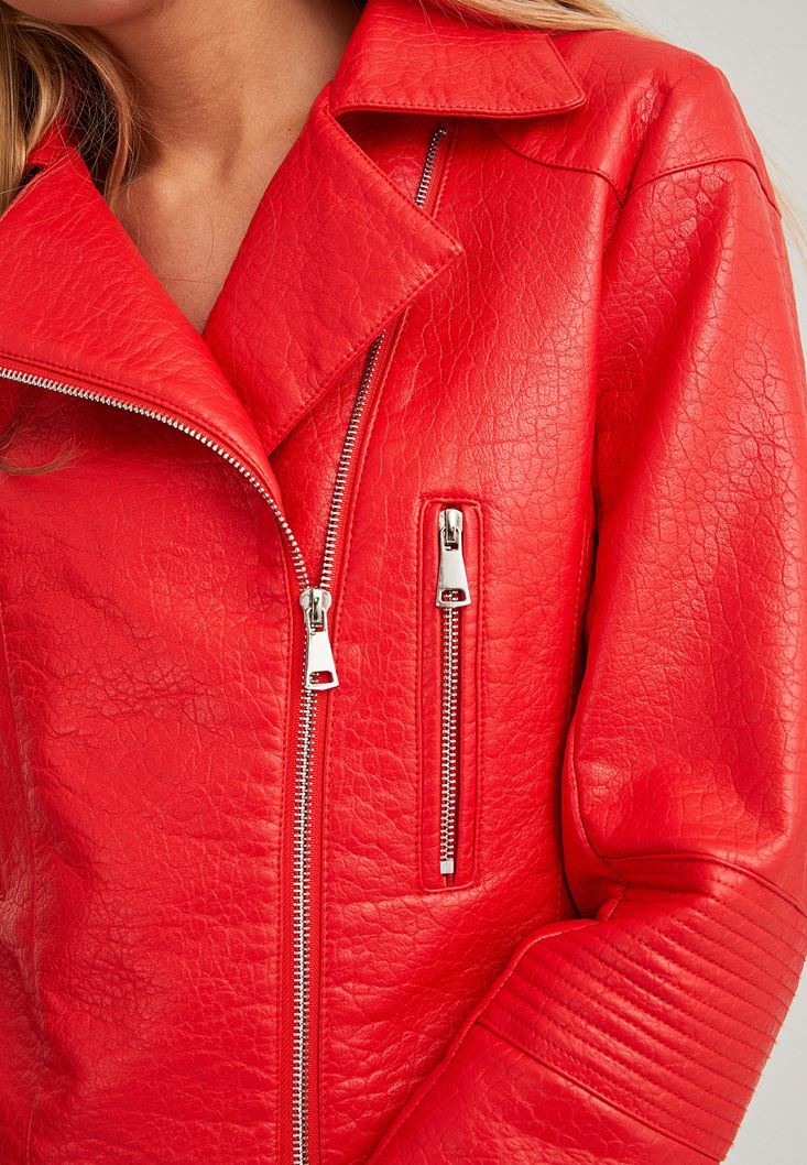 • Bayan Kırmızı Fermuar Detaylı Biker Ceket