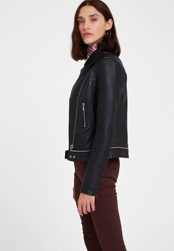 Siyah Fermuar Detaylı Deri Biker Ceket