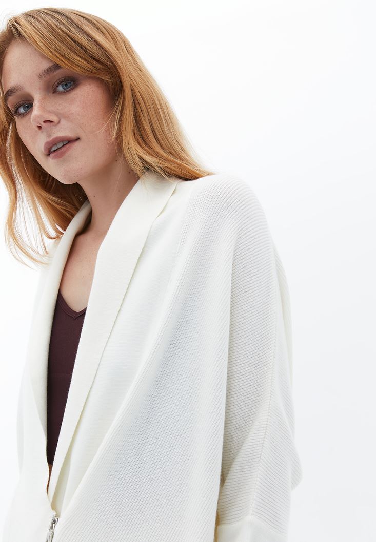 • Bayan Krem Fermuar Detaylı Hırka