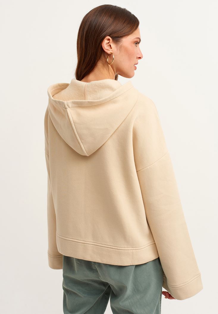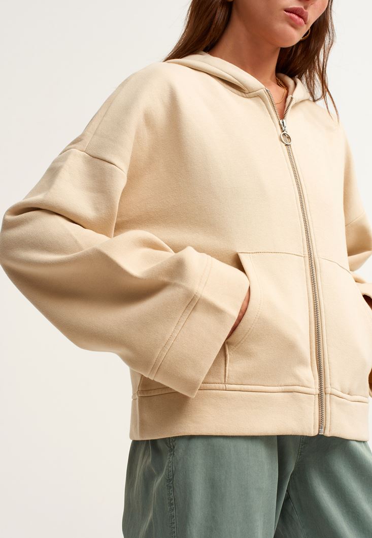 Bej Fermuar Detaylı Kapüşonlu Sweatshirt