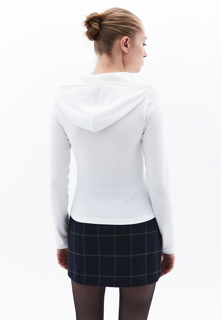Krem Fermuar Detaylı Kapüşonlu Tişört