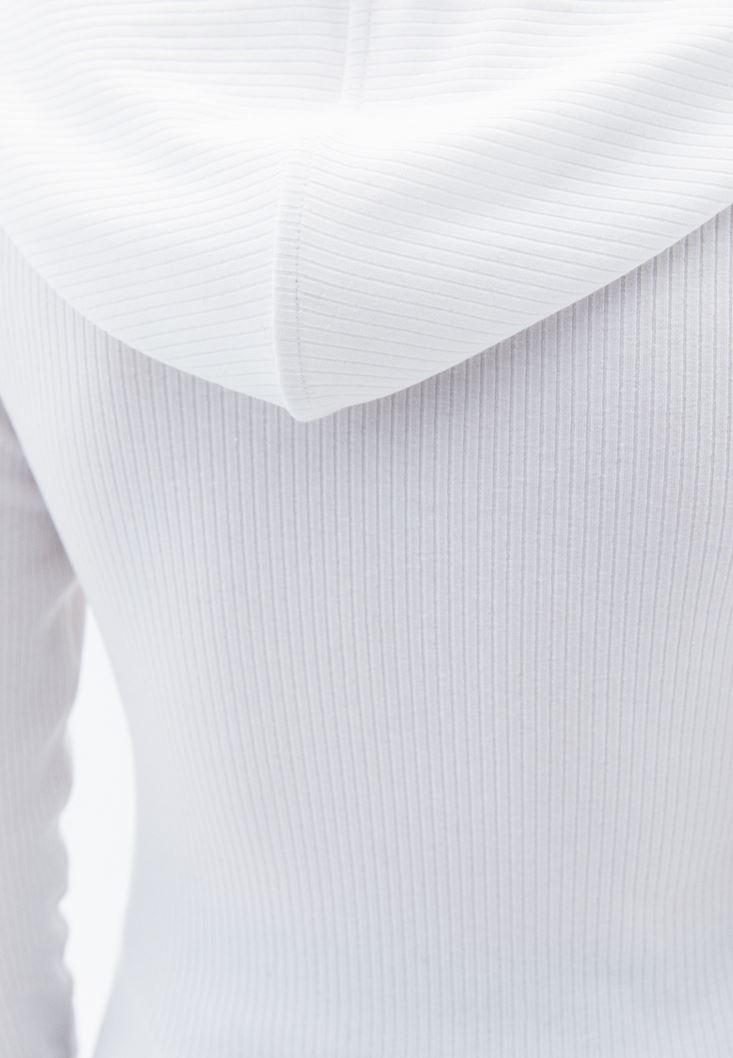 • Bayan Krem Fermuar Detaylı Kapüşonlu Tişört
