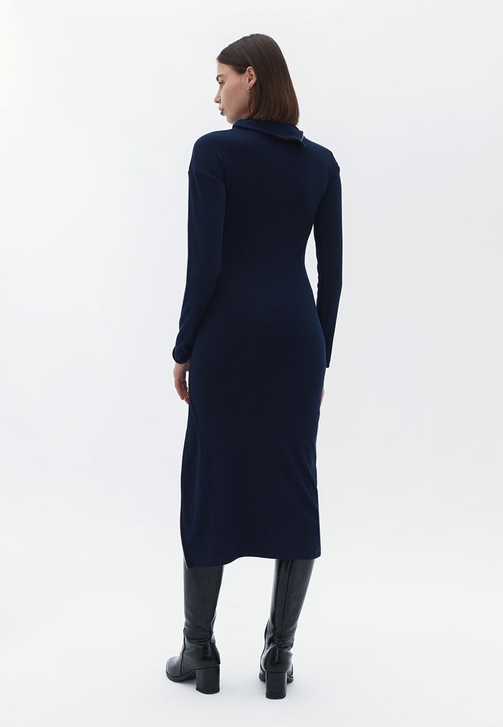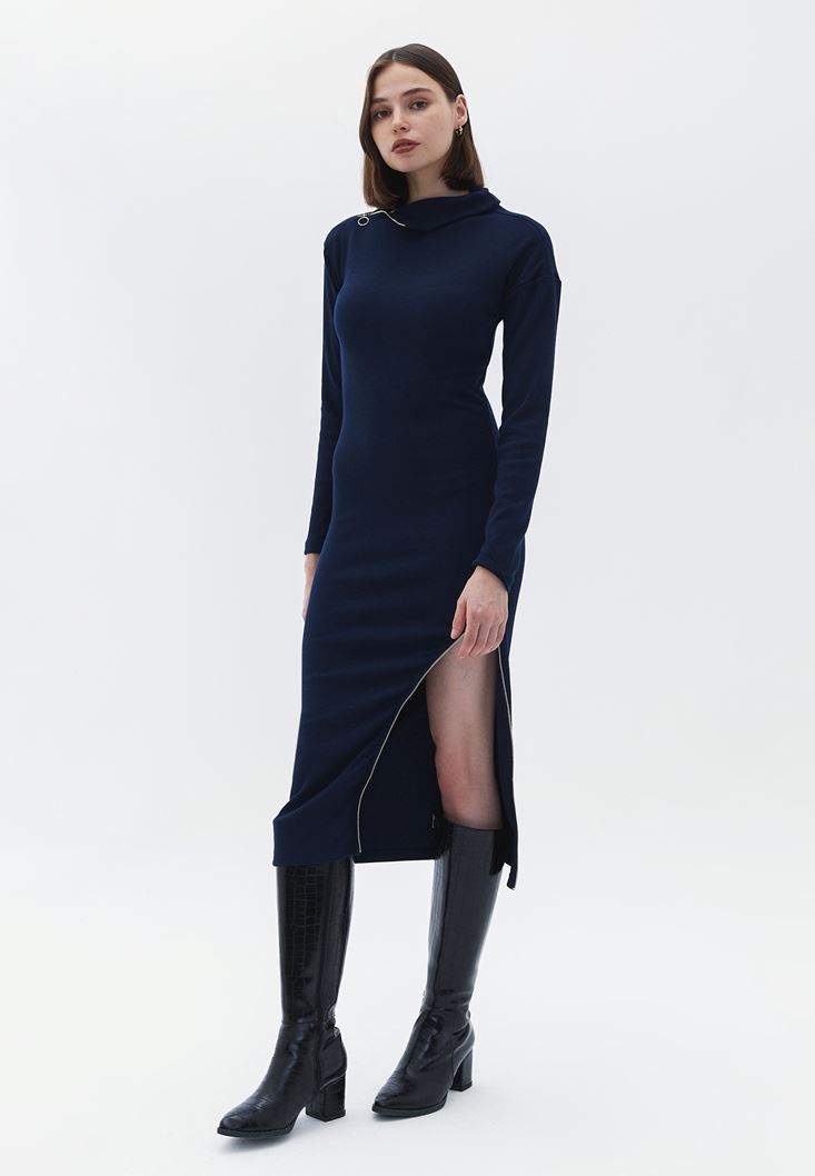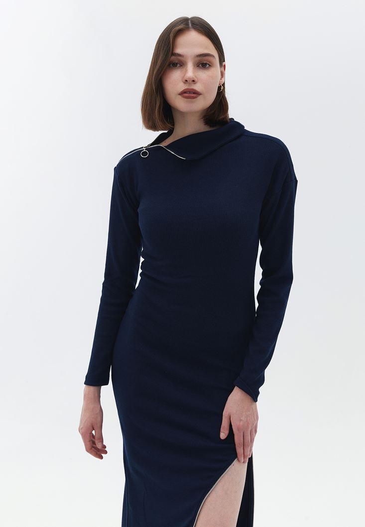 • Bayan Lacivert Fermuar Detaylı Midi Elbise