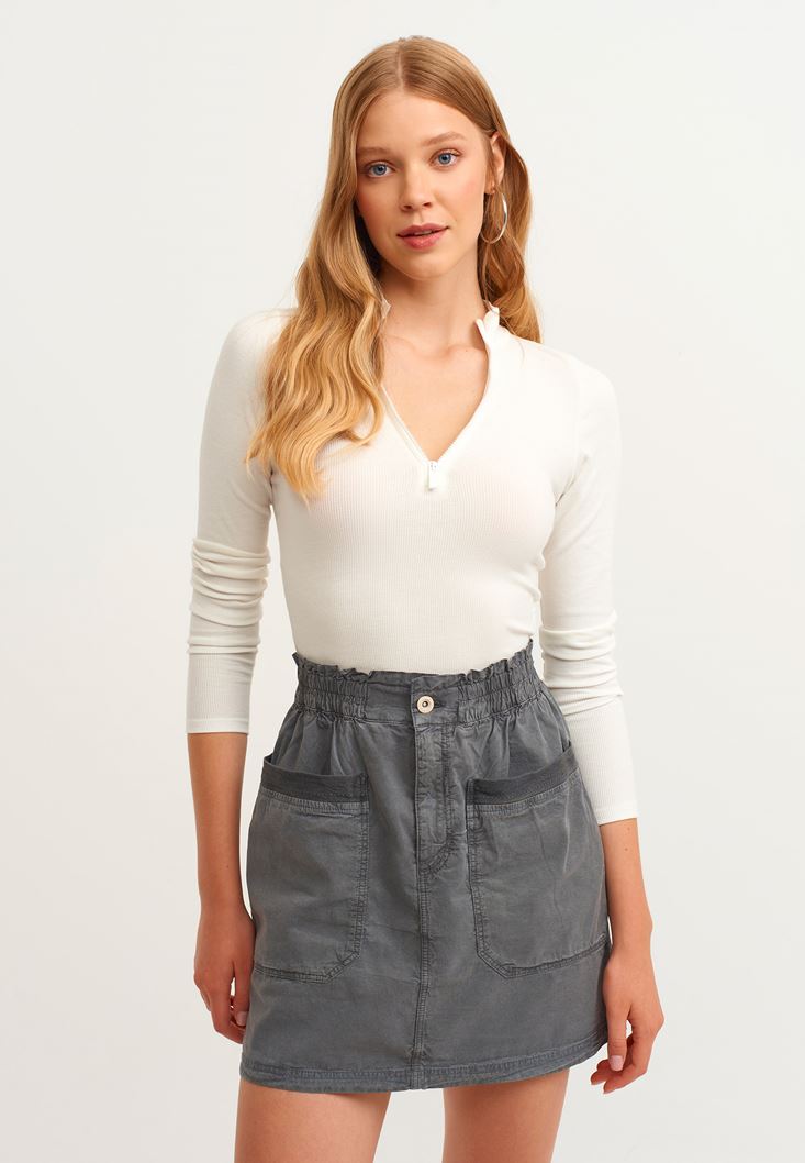 • Bayan Krem Fermuar Detaylı Uzun Kollu Tişört
