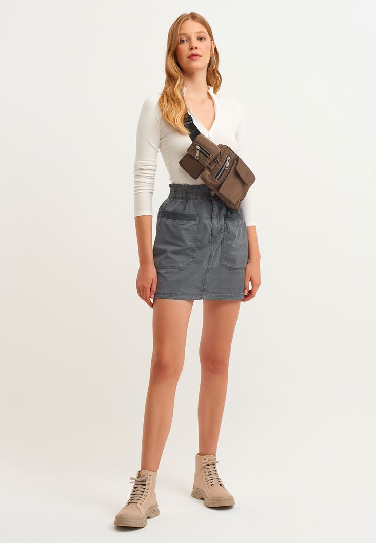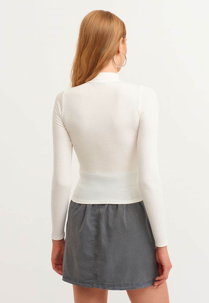 Krem Fermuar Detaylı Uzun Kollu Tişört