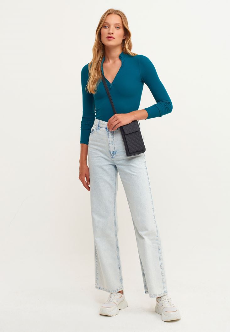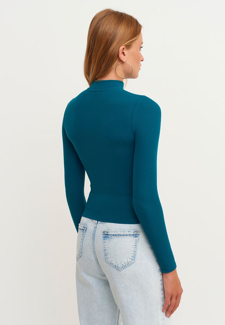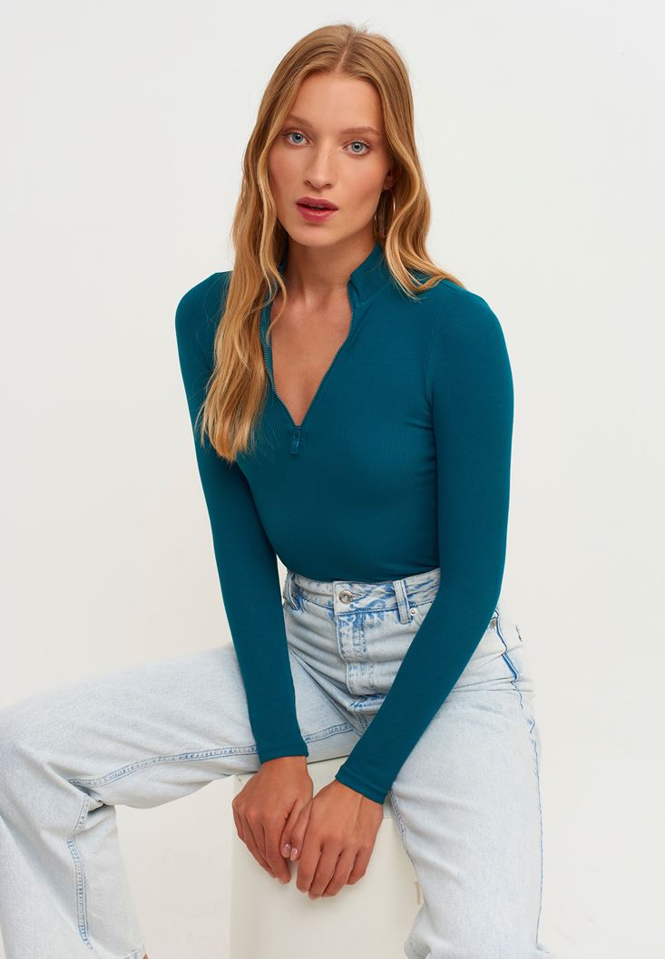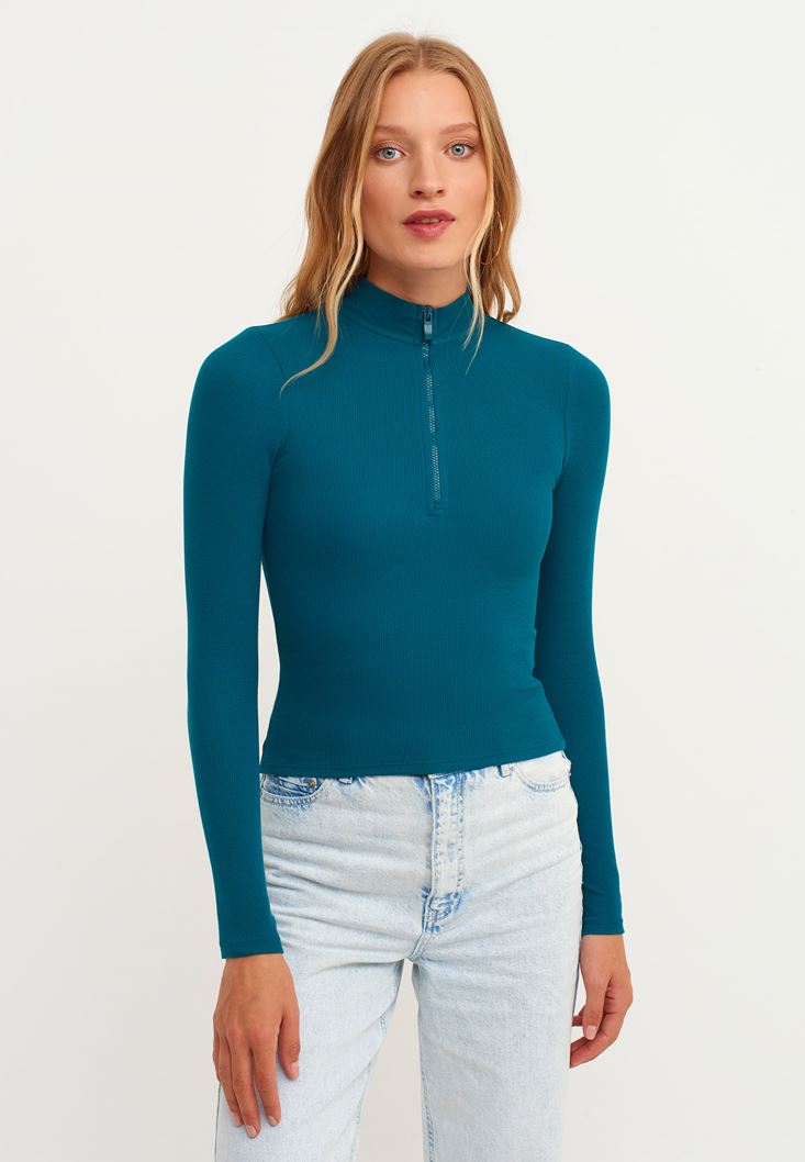 • Bayan Mavi Fermuar Detaylı Uzun Kollu Tişört