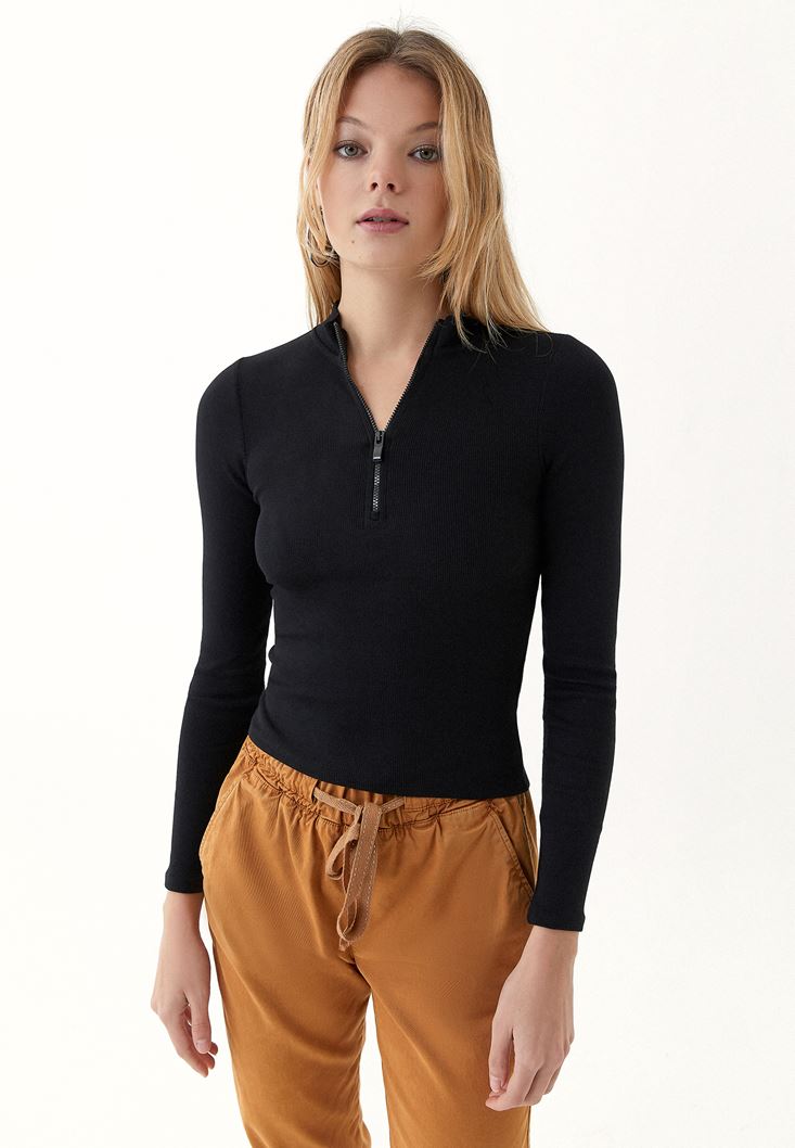 • Bayan Siyah Fermuar Detaylı Uzun Kollu Tişört