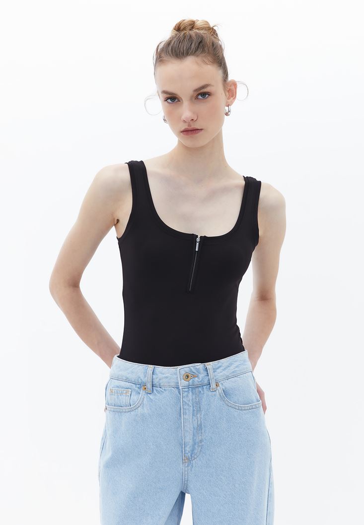 Fermuarlı Atlet ve Denim Pantolon Kombini