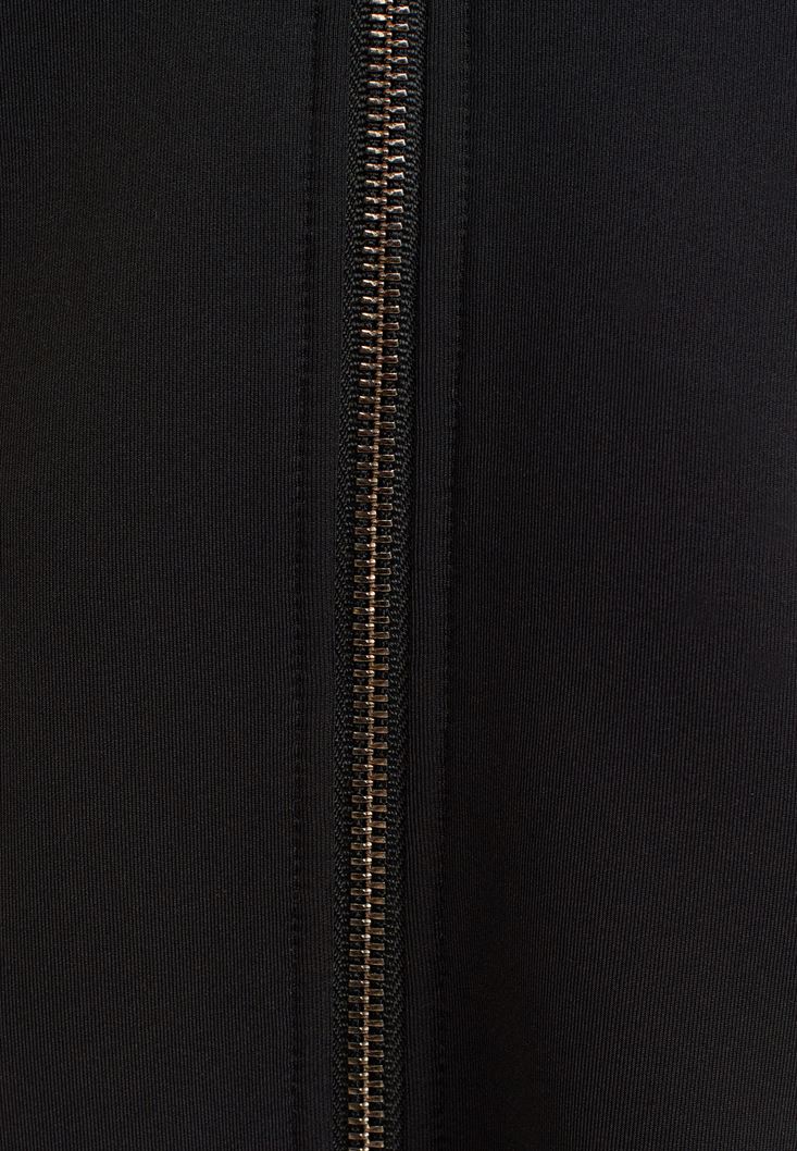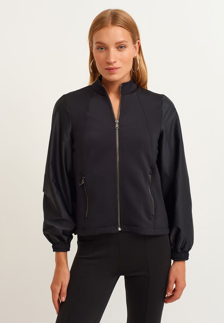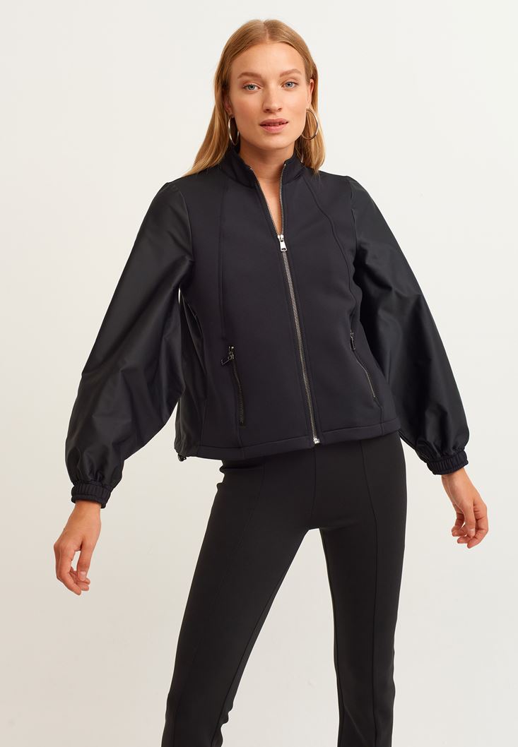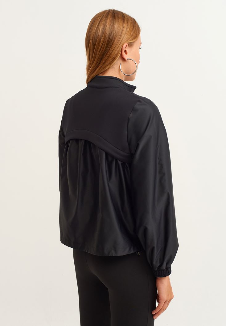 İki farklı doku birleşimi ile spora uygun form, fermuar kapamalı, balon kollu, kol ucu lastikli, yüksek yaka, ön kısmı iki cepli, cepleri fermuar kapamalı.