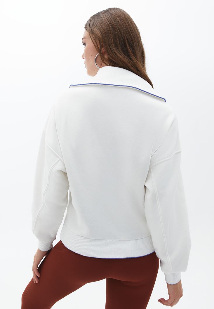 Pamuk karışımlı sweat doku, yüksek yaka, bedene yakın rahat fit, uzun kollu, yakası fermuarlı.