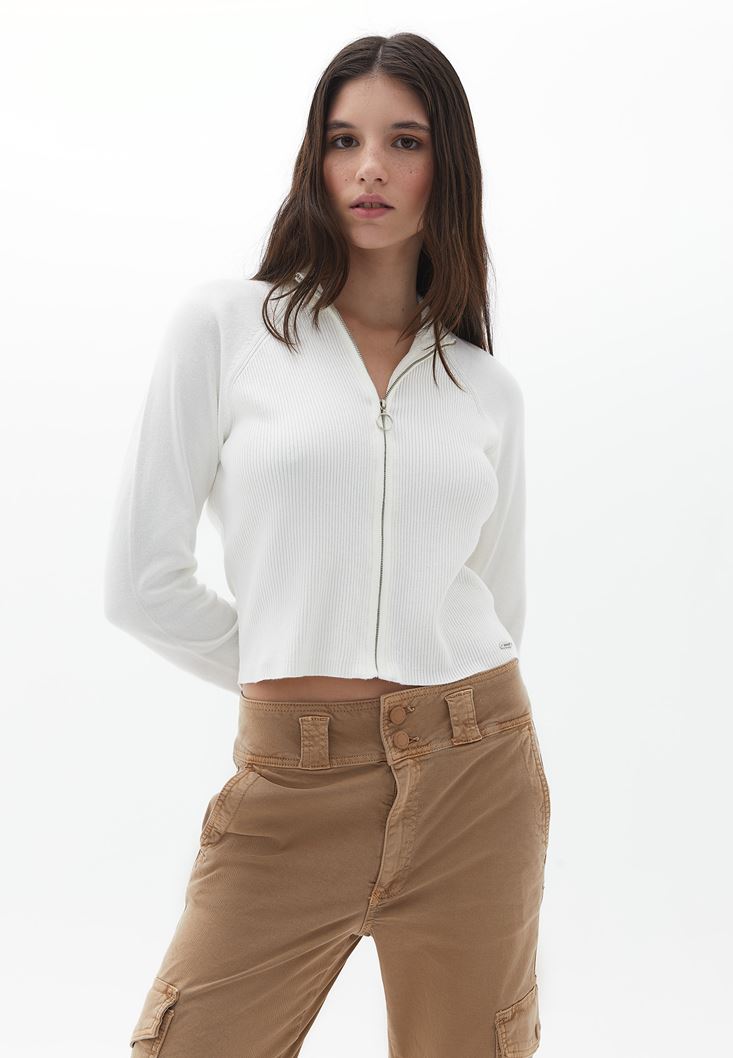 Krem Fermuarlı Triko Hırka