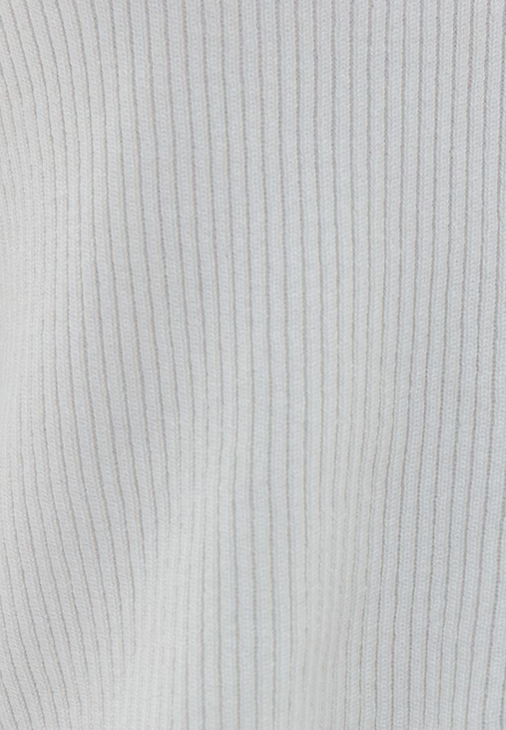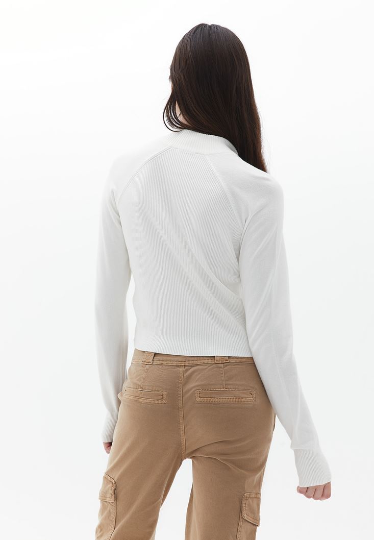 Viskon karışımlı triko, fitilli örgü, fermuar kapamalı, yüksek yaka, crop kesim, uzun kollu, bedene yakın fit.