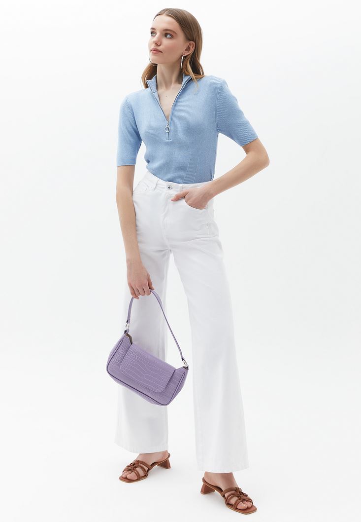 Pamuk karışımlı triko, jakarlı örgü, fermuarlı yüksek yaka, kısa kollu, bedeni saran esnek fit, standart boy.
