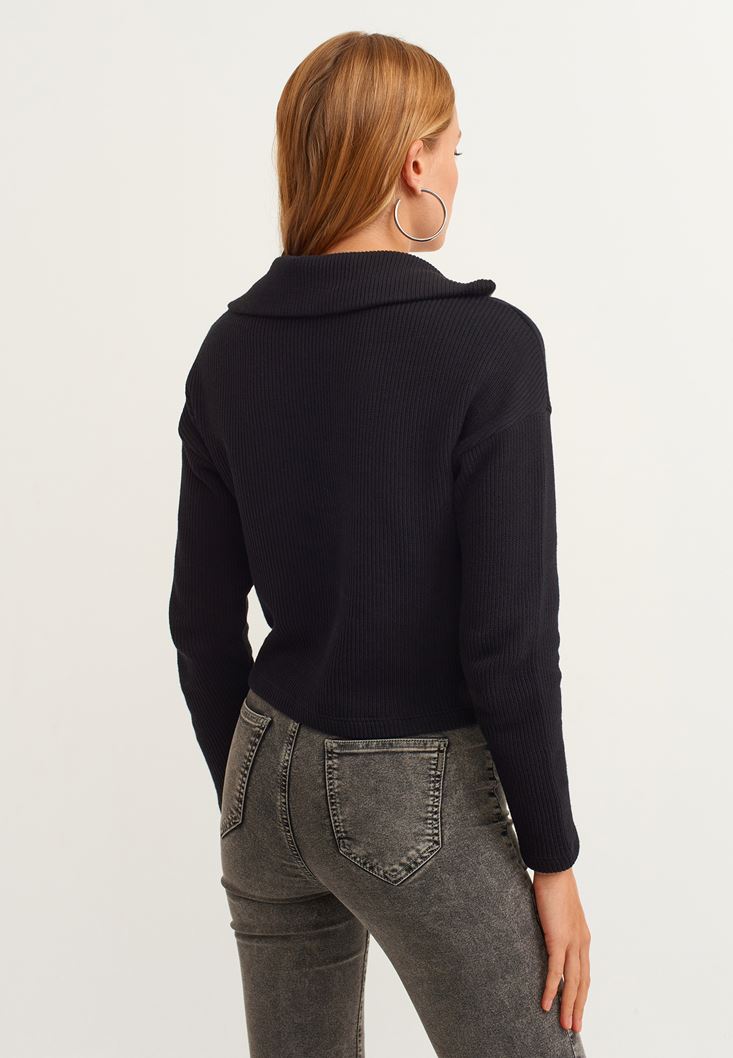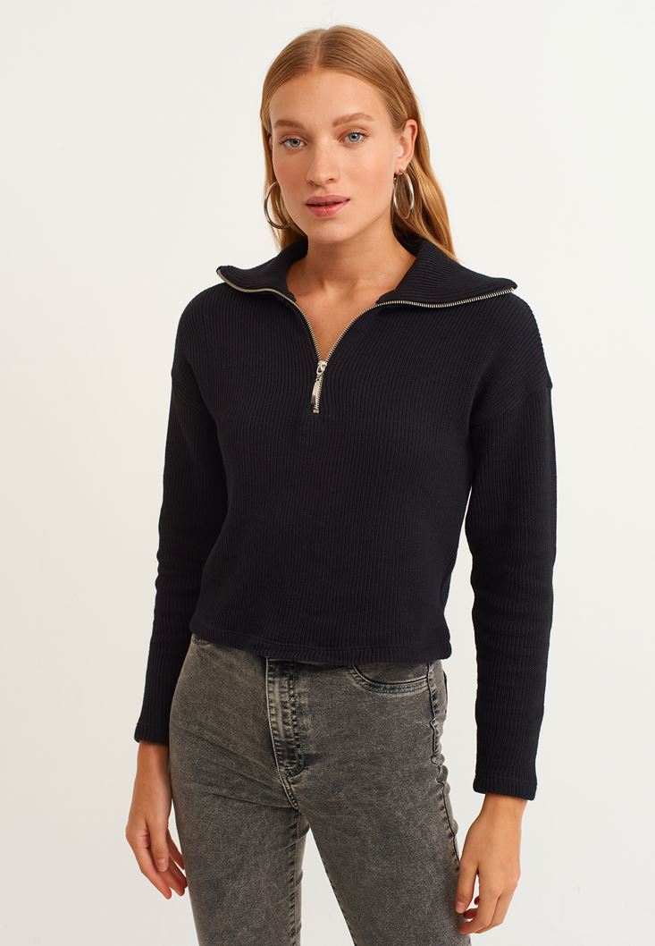 • Bayan Siyah Fermuarlı Uzun Kollu Kazak