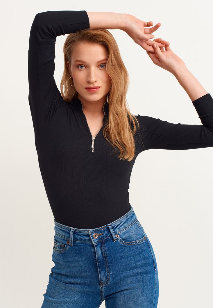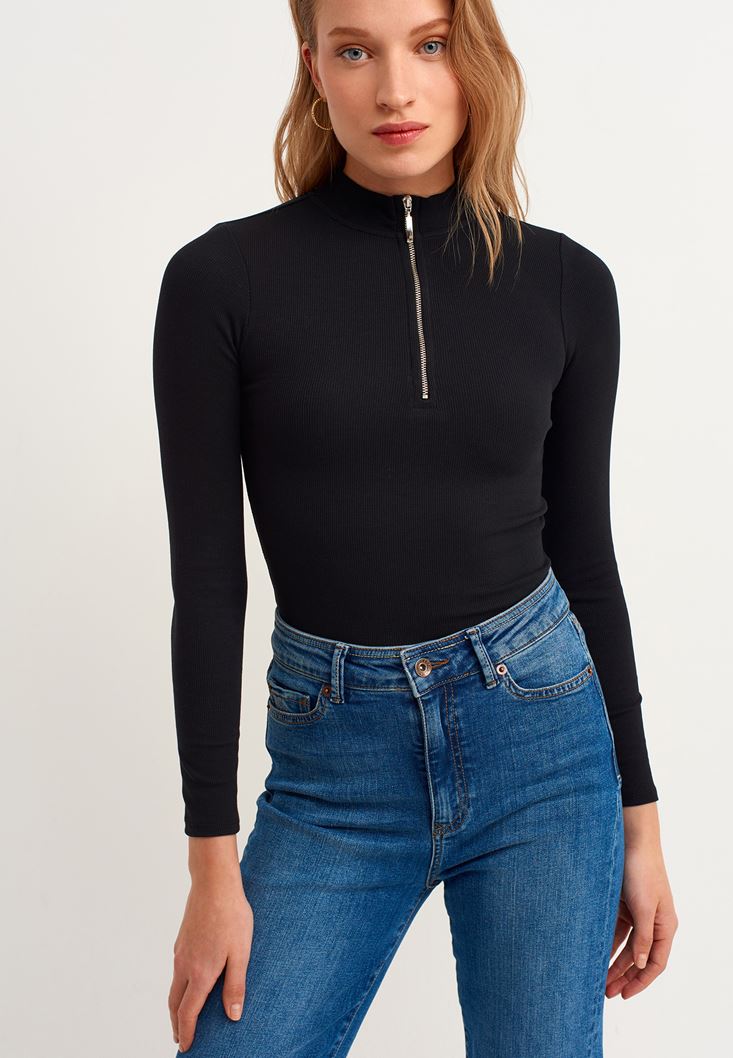 • Bayan Siyah Fermuarlı Yaka Casual Top